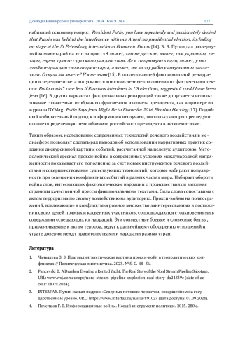 1. Чанышева З. З. Прагмалингвистическая картина прокси-войн в геополитических конфликтах // Политическая лингвистика. 2023. №5. С. 48-56. EDN: UJIRAG
