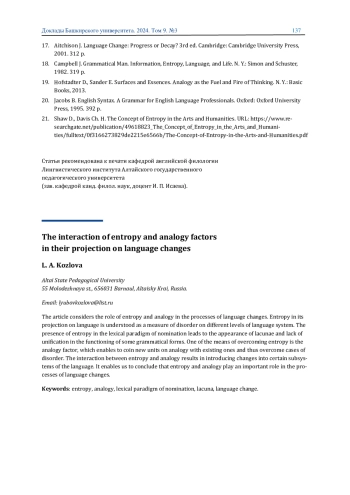 В статье рассматривается роль энтропии и аналогии в процессах языковых изменении. Энтропия в ее проекции на язык трактуется как мера неупорядоченности в системе языка на ее различных уровнях. Примером энтропии могут служить сбои в механизме словообразования, приводящие к появлению лакун в лексической парадигме номинации, а также нарушение единообразия в употреблении некоторых грамматических форм. Одним из средств преодоления энтропии выступает фактор аналогии, позволяющий создавать новые единицы по аналогии с уже имеющимися и тем самым преодолевать элементы неупорядоченности. Результатом взаимодействия энтропии и аналогии является внесение изменении в отдельные участки языковой системы, что позволяет заключить, что энтропия и аналогия играют важную роль в процессах изменения языка.