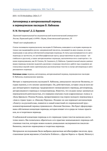 Интерес к переводческому наследию В. Набокова, уникального писателя-билингва, сегодня огромен, и это вполне закономерно. Он, действительно, оставил след во всех видах литературного перевода: традиционного межъязыкового перевода, автоперевода, авторизованного перевода и псевдоперевода.