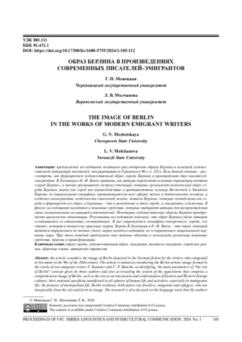 Предлагаемое исследование посвящено рассмотрению образа Берлина в немецкой художественной литературе писателей, эмигрировавших в Германию в 90-е гг. XX в. Цель данной статьи - рассмотреть, как формируется художественный образ города Берлина в произведениях двух писателей-эмигрантов: В. Каминера и К.-Ф. Банчу, выявить, как авторы определяют основные параметры понятия «город Берлин», а также раскрывают систему оппозиций, которые организуют комплексный образ города Берлина, таких как город как взаимодействие и противостояние культур Восточной и Западной Европы, их национальная специфика, проявляющаяся во всех сферах жизни и деятельности человека, а особенно иммигрантов, особенности столичной жизни, жители Берлина, которые неотделимы от города и формируют его образ, а берлинцы - это и рожденные в этом городе, и эмигранты, и беженцы. В фокусе исследования находятся и языковые средства, которые выбирают авторы для воспроизведения своих эмоциональных ассоциаций и впечатлений. Некоторые художественные образы Берлина приобретают иронические коннотации. Результаты исследования показали, что образ Берлина обоих авторов складывается из одинаковых составляющих. В них отражается специфика конкретного города, его статус, история и только ему присущие черты. Берлин В. Каминера и К.-Ф. Банчу - это город, который является отражением не только узкого мирка каждого индивида, но и отражением национальной картины мира. При этом каждый предлагает свое видение объекта и использует различные языковые средства, приемы и трансформации.