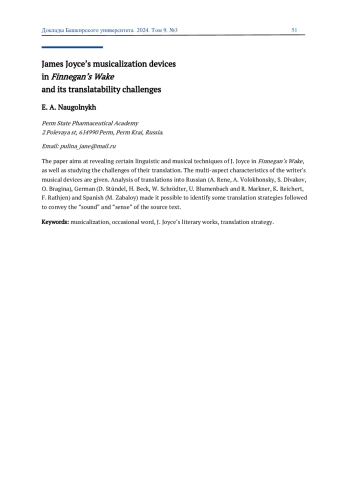 Статья посвящена особенностям лингвомузыкальных приемов в романе Дж. Джойса «Поминки по Финнегану» и трудностям ее межъязыковой трансляции. Приведена разноаспектная характеристика музыкальной техники писателя. Анализ переводов на русский (А. Рене, А. Волохоннский, С. Диваков, О. Брагина), немецкий (Д. Штюндель, Г. Бек, В. Шредтер, У. Блуменбах и Р. Маркнер, К. Райхарт, Ф. Ратьен) и испанский языки (М. Забалой) позволил выделить некоторые переводческие стратегии, которых придерживаются переводчики в поисках способов передачи «звучания» оригинала с максимальным сохранением смысловой составляющей исходного текста.
