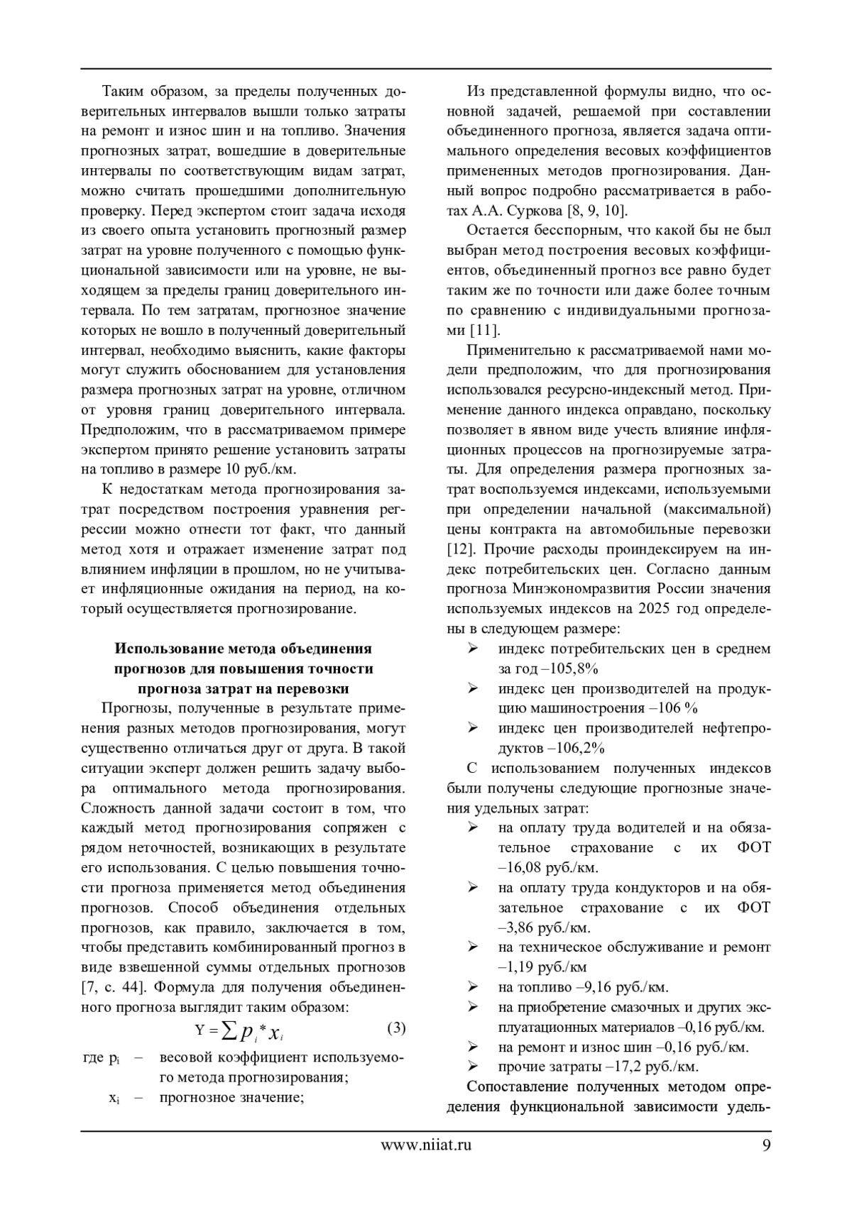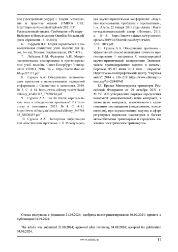 В данной статье рассматривается применение метода объединения прогнозов для повышения точности прогноза затрат на осуществление перевозок на примере перевозок автобусным транспортом. Авторами перечисляются основные методы прогнозирования затрат. Наиболее подробно рассматривается метод прогнозирования затрат посредством выведения функциональной зависимости: приводится алгоритм построения доверительных интервалов для прогнозирования затрат на осуществление перевозок. Формулируется предложение производить сопоставление полученных на основе функциональной зависимости прогнозных затрат транспорта на один километр пробега с уровнями удельных затрат, составляющими доверительный интервал