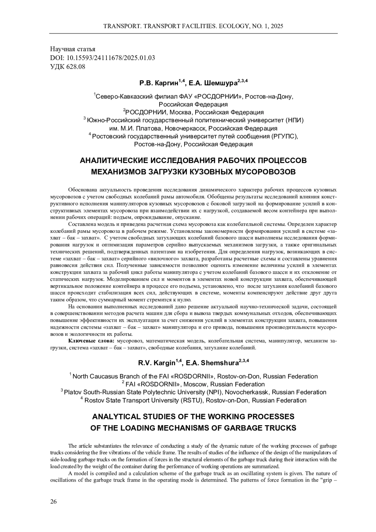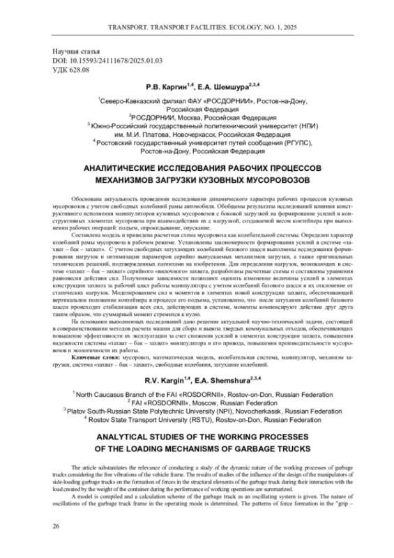 Обоснована актуальность проведения исследования динамического характера рабочих процессов кузовных мусоровозов с учетом свободных колебаний рамы автомобиля. Обобщены результаты исследований влияния конструктивного исполнения манипуляторов кузовных мусоровозов с боковой загрузкой на формирование усилий в конструктивных элементах мусоровоза при взаимодействии их с нагрузкой, создаваемой весом контейнера при выполнении рабочих операций: подъем, опрокидывание, опускание. Составлена модель и приведена расчетная схема мусоровоза как колебательной системы. Определен характер колебаний рамы мусоровоза в рабочем режиме. Установлены закономерности формирования усилий в системе «захват - бак - захват». С учетом свободных затухающих колебаний базового шасси выполнены исследования формирования нагрузок и оптимизация параметров серийно выпускаемых механизмов загрузки, а также оригинальных технических решений, подтвержденных патентами на изобретения. Для определения нагрузок, возникающих в системе «захват - бак - захват» серийного «вилочного» захвата, разработаны расчетные схемы и составлены уравнения равновесия действия сил. Полученные зависимости позволяют оценить изменение величины усилий в элементах конструкции захвата за рабочий цикл работы манипулятора с учетом колебаний базового шасси и их отклонение от статических нагрузок. Моделированием сил и моментов в элементах новой конструкции захвата, обеспечивающей вертикальное положение контейнера в процессе его подъема, установлено, что после затухания колебаний базового шасси происходит стабилизация всех сил, действующих в системе, моменты компенсируют действие друг друга таким образом, что суммарный момент стремится к нулю. На основании выполненных исследований дано решение актуальной научно-технической задачи, состоящей в совершенствовании методов расчета машин для сбора и вывоза твердых коммунальных отходов, обеспечивающих повышение эффективности их эксплуатации за счет снижения усилий в элементах конструкции захвата, повышения надежности системы «захват - бак - захват» манипулятора и его привода, повышения производительности мусоровозов и экологичности их работы.