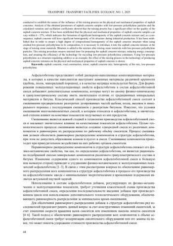 Асфальтобетоны представляют собой композиционный материал, состоящий из минеральных материалов различного гранулометрического состава и битума. Для регулирования физико-механических и эксплуатационных показателей асфальтобетонов в состав асфальтобетонной смеси вводят дополнительные компоненты. Использование в составе асфальтобетонов различных добавок требует уточнения классической схемы производства асфальтобетонной смеси, определения последовательности введения добавки и технологических режимов ее производства. В большинстве опубликованных работ по использованию структурорегулирующих добавок в составе асфальтобетона не рассматриваются вопросы технологии производства асфальтобетонной смеси. Как правило, в исследованиях указаны полученные результаты без упоминания технологических режимов, в том числе очередности смешивания компонентов. На примере использования измельченных отходов полиэтилена низкого давления в качестве структурорегулирующей добавки проведено исследование по установлению характера влияния на физико-механические показатели асфальтобетонов процесса смешивания. Анализ полученных показателей асфальтобетонных образцов с частицами полиэтилена низкого давления и вычисленные коэффициенты вариации и осцилляции показали, что на качество асфальтобетонной смеси процесс смешивания оказывает значительное влияние. Установлено, что физико-механические показатели образцов асфальтобетона могут варьироваться в пределах 6-15 %, что указывает на формирование существенной неоднородности асфальтобетонной смеси и, как следствие, асфальтобетон будет иметь значительную неоднородность своей структуры при промышленном выпуске. Установлено, что для обеспечения высокой степени композиционной однородности структуры асфальтобетона при использовании в его составе измельченного полиэтилена низкого давления необходимо его вводить в состав асфальтобетонной смеси на этапе смешивания каменных материалов. Битум добавляется в смесь после перемешивания каменных материалов с частицами полиэтилена низкого давления. Такой порядок смешивания обеспечивает минимальное время приготовления асфальтобетонной смеси, снижение потребления энергетических ресурсов, обеспечение эффективности технологии утилизации тары из полиэтилена низкого давления. На примере использования полиэтилена низкого давления в качестве структурорегулируюшей добавки показано влияние процесса смешивания в технологии производства асфальтобетонных смесей на физико-механические свойства асфальтобетона.