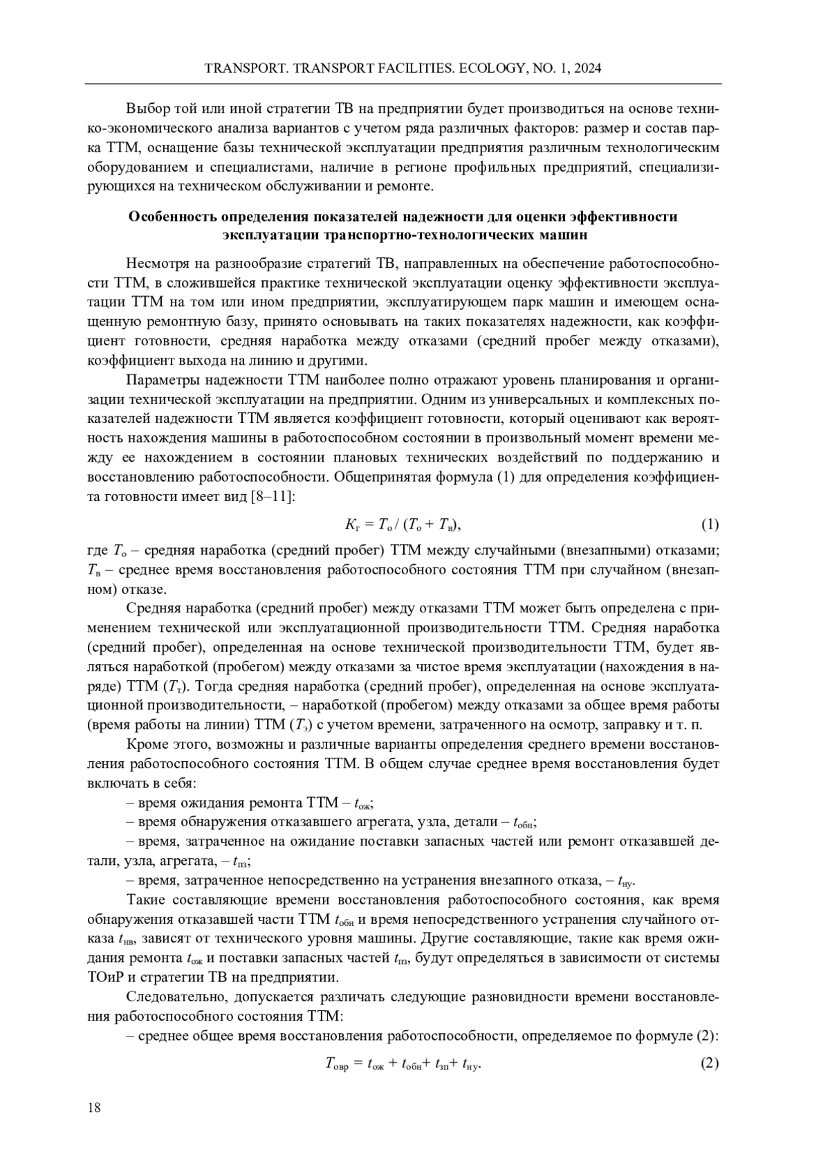 В процессе эксплуатации транспортно-технологических машин происходит ухудшение их технического состояния и потеря работоспособности, в том числе из-за внезапных отказов. Поддержанием и восстановлением работоспособного состояния машин занимаются службы технической эксплуатации предприятий путем применения различных стратегий технических воздействий в рамках системы технических обслуживаний и ремонтов. Оценку эффективности эксплуатации машин принято производить на основе фактических показателей надежности, основными из которых являются коэффициент готовности и средняя наработка между отказами, которые не в полной мере позволяют оценить уровень организации эксплуатации машин на предприятии. В данном исследовании для транспортно-технологических машин установлены варианты определения средней наработки между отказами и среднего времени восстановления работоспособного состояния в зависимости от технической или эксплуатационной производительности машины. На этой основе установлены четыре варианта определения коэффициента готовности транспортно-технологических машин, несущих различный технический смысл и характеризующих надежность машин в интенсивных условиях эксплуатации, при определенной стратегии технических воздействий и фактическом уровне организации технической эксплуатации на предприятии. В результате анализа показателей надежности транспортно-технологических машин разработано предложение о проведении оценки эффективности эксплуатации машин на предприятии по критерию надежности с учетом финансовых затрат на восстановление работоспособности машин после внезапных отказов на основании дополнительного критерия - «показателя весомости внезапного отказа» транспортно-технологических машин. Предлагаемый показатель учитывает коэффициент готовности, определенный на основании наработки между отказами по эксплуатационной производительности машины и общего времени восстановления ее работоспособного состояния, а также коэффициент, учитывающий размер затрат на восстановление работоспособности относительно балансовой стоимости машины. Показатель весомости внезапного отказа не противоречит общепризнанным теориям, в том числе теории риска, и может быть использован для оценки уровня надежности машин, обеспечиваемого принятой на предприятии стратегией технических воздействий в рамках системы технических обслуживаний и ремонтов.