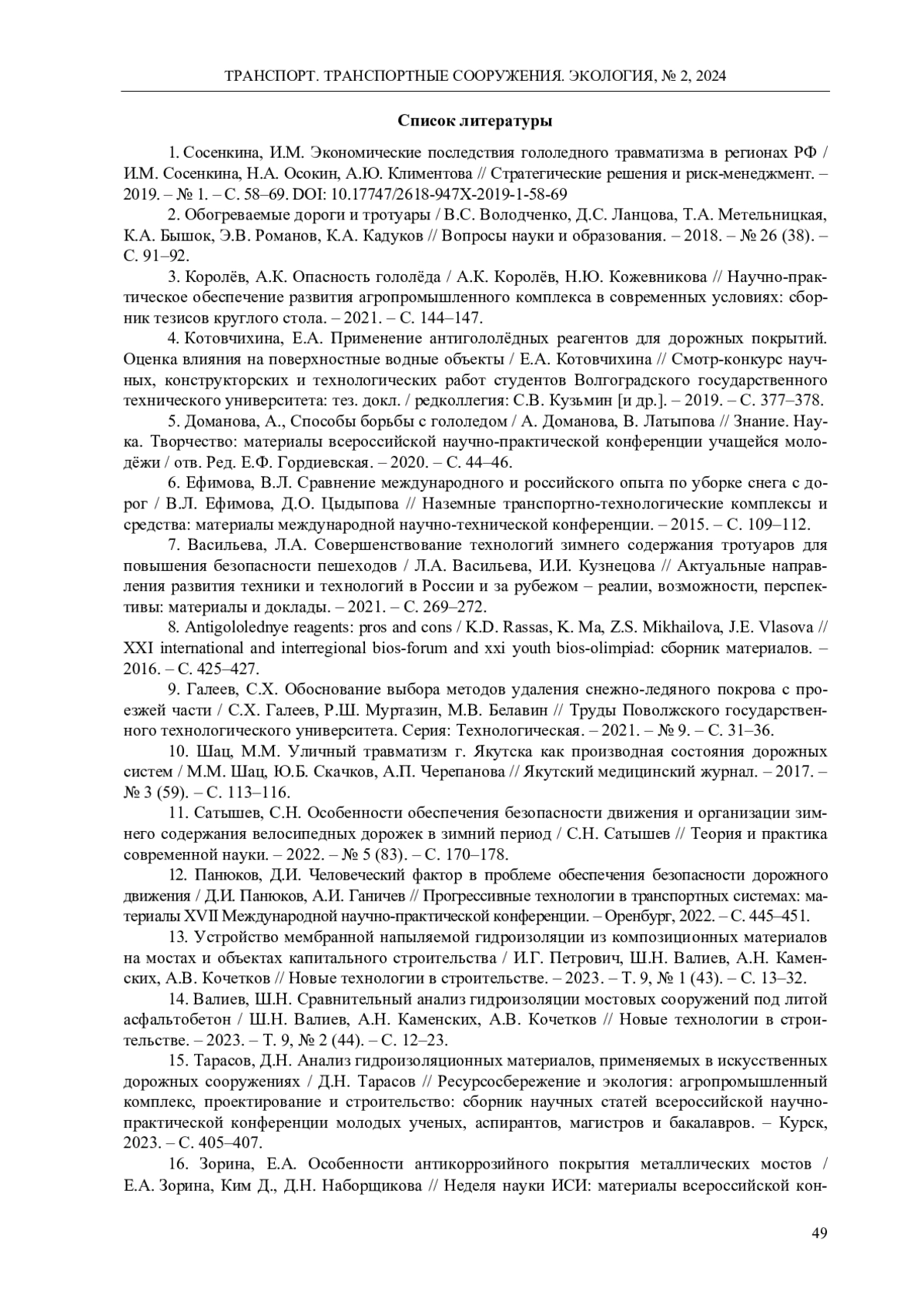 15. Тарасов, Д.Н. Анализ гидроизоляционных материалов, применяемых в искусственных дорожных сооружениях / Д.Н. Тарасов // Ресурсосбережение и экология: агропромышленный комплекс, проектирование и строительство: сборник научных статей всероссийской научно-практической конференции молодых ученых, аспирантов, магистров и бакалавров. - Курск, 2023. - С. 405-407. EDN: GQDOXO