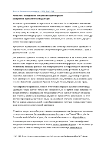 Синхронный перевод остается прерогативой переводчика-человека, поскольку предлагает не только передачу лингвистических элементов, а в первую очередь смысловой составляющей исходного сообщения, которое необходимо преобразовать в процессе прагматической адаптации для целевой аудитории. Стратегии компрессии и декомпрессии как инструменты прагматической адаптации играют ключевую роль, поскольку позволяют обеспечить эффективную коммуникацию, что особенно важно на международных мероприятиях. В статье приводятся результаты исследования синхронного перевода панельной сессии с русского на английский язык в рамках «Российской энергетической недели».