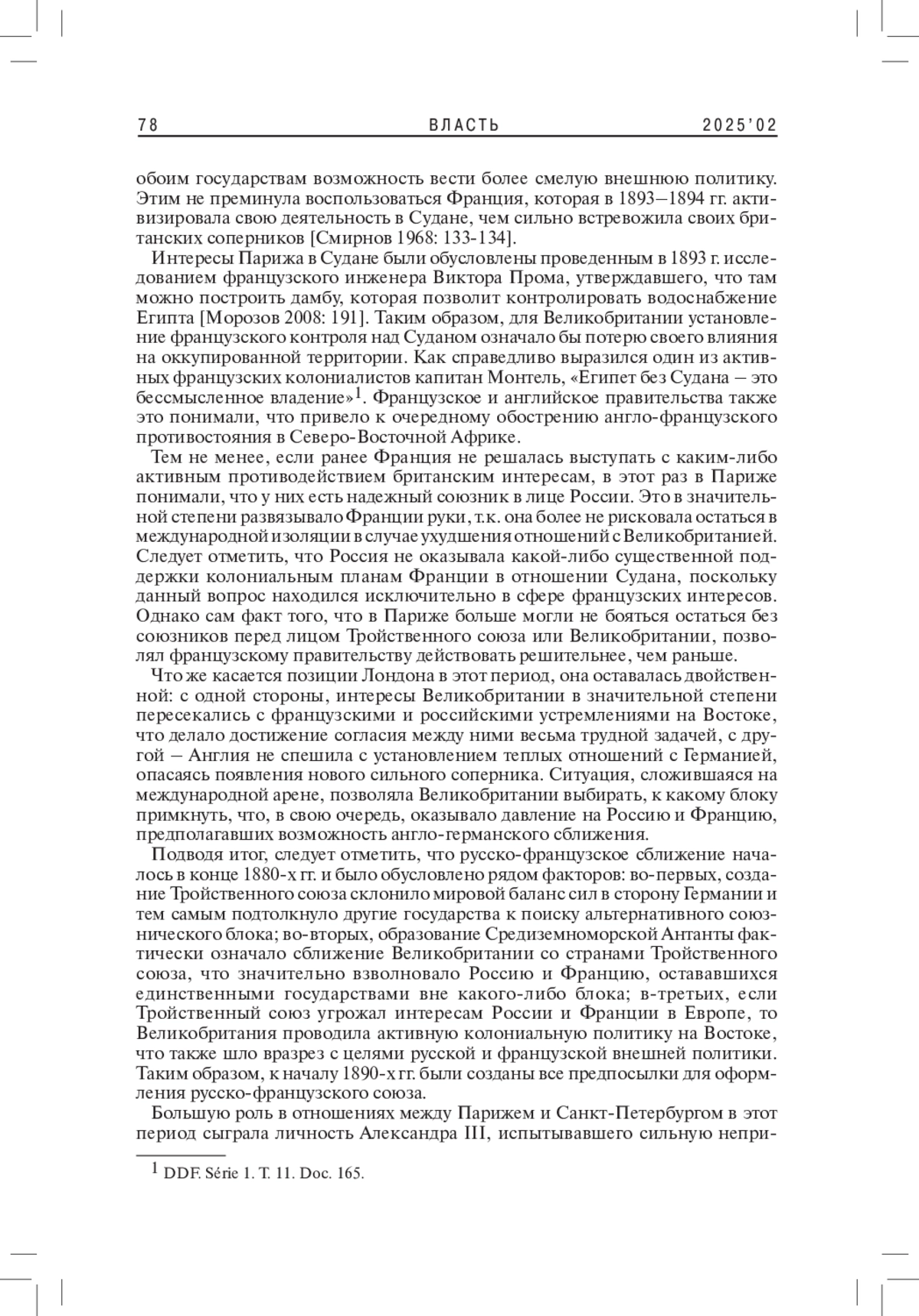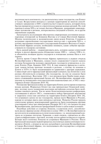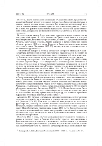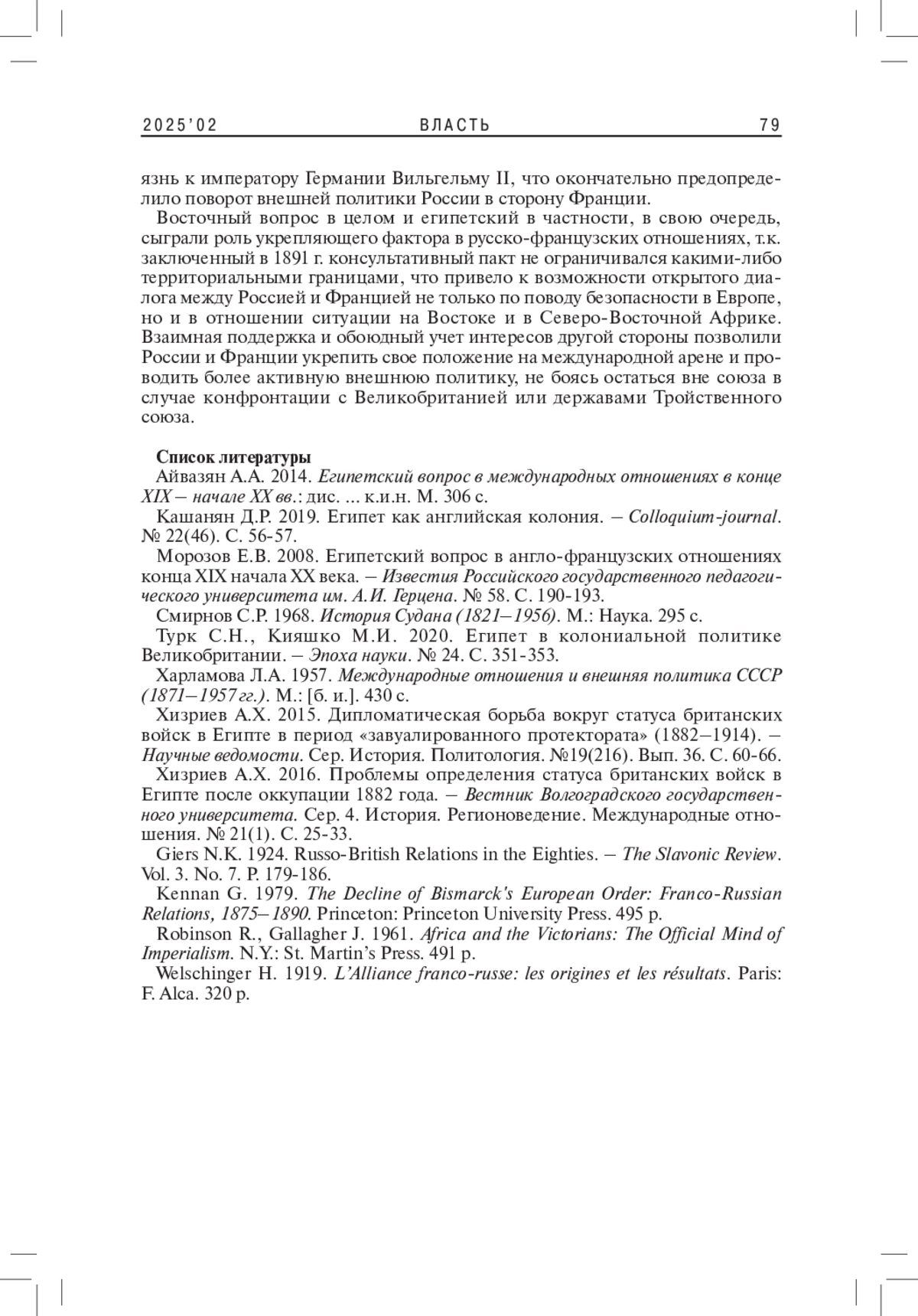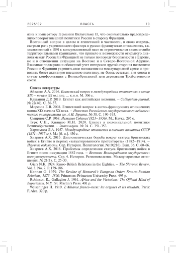 ХАРЬКОВСКИЙ Р. Г. ЕГИПЕТСКИЙ ВОПРОС В РУССКО-ФРАНЦУЗСКОМ СБЛИЖЕНИИ КОНЦА 1880-Х - НАЧАЛА 1890-Х ГГ. // ВЛАСТЬ. 2025. ТОМ 33 № 2