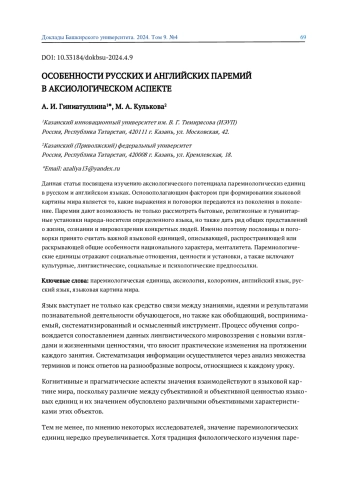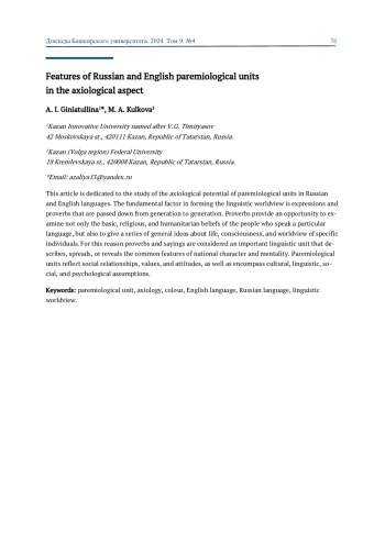 1. Гиниатуллина А. И. Отражение ценностных ориентаций в английских и русских паремиологических единицах // Традиции и инновации в преподавании иностранного языка: мат-лы X Всерос. научно-практ. конф. Казань: Казанский ГМУ, 2020. С. 86-92. EDN: DCGQTG