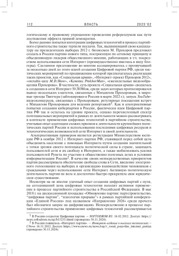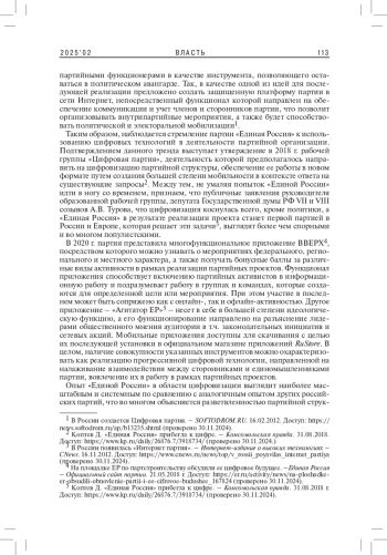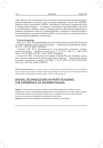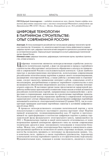 ЕЖОВ Д. А. ЦИФРОВЫЕ ТЕХНОЛОГИИ В ПАРТИЙНОМ СТРОИТЕЛЬСТВЕ: ОПЫТ СОВРЕМЕННОЙ РОССИИ // ВЛАСТЬ. 2025. ТОМ 33 № 2