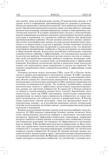 Статья: ЭФФЕКТИВНОСТЬ ИСПОЛЬЗОВАНИЯ БОЛЬШИХ ДАННЫХ В ПОЛИТИЧЕСКИХ КАМПАНИЯХ: СРАВНЕНИЕ ОПЫТА США, ЕС И РОССИИ (2025)