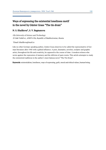 Статья: СПОСОБЫ ВЫРАЖЕНИЯ МОТИВА ЭКЗИСТЕНЦИОНАЛЬНОГО ОДИНОЧЕСТВА В РОМАНЕ ГЮНТЕРА ГРАССА "ЖЕСТЯНОЙ БАРАБАН" (2024)