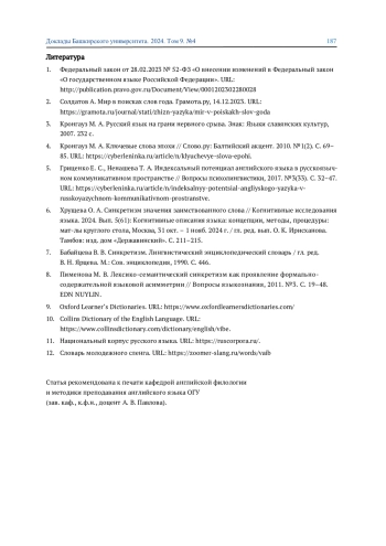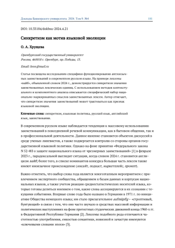 Статья посвящена исследованию специфики функционирования англоязычных заимствований в современном русском языке. На примере лексемы «вайб», объявленной словом 2024 г., демонстрируется синкретизм значения заимствованных лексических единиц. С использованием методов контекстуального и компонентного анализа описывается специфический набор национально-маркированных смыслов заимствованных лексем. Автор отмечает, что синкретизм значения заимствований может трактоваться как признак языковой эволюции.