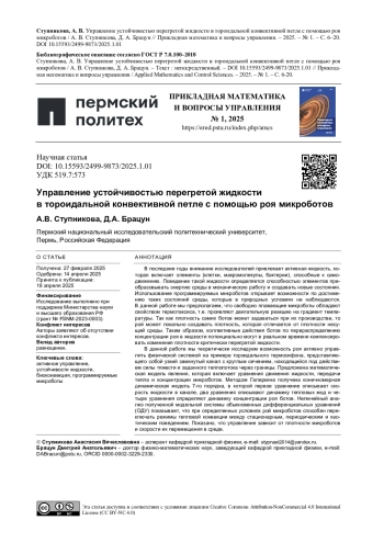 Статья: УПРАВЛЕНИЕ УСТОЙЧИВОСТЬЮ ПЕРЕГРЕТОЙ ЖИДКОСТИ В ТОРОИДАЛЬНОЙ КОНВЕКТИВНОЙ ПЕТЛЕ С ПОМОЩЬЮ РОЯ МИКРОБОТОВ (2025)