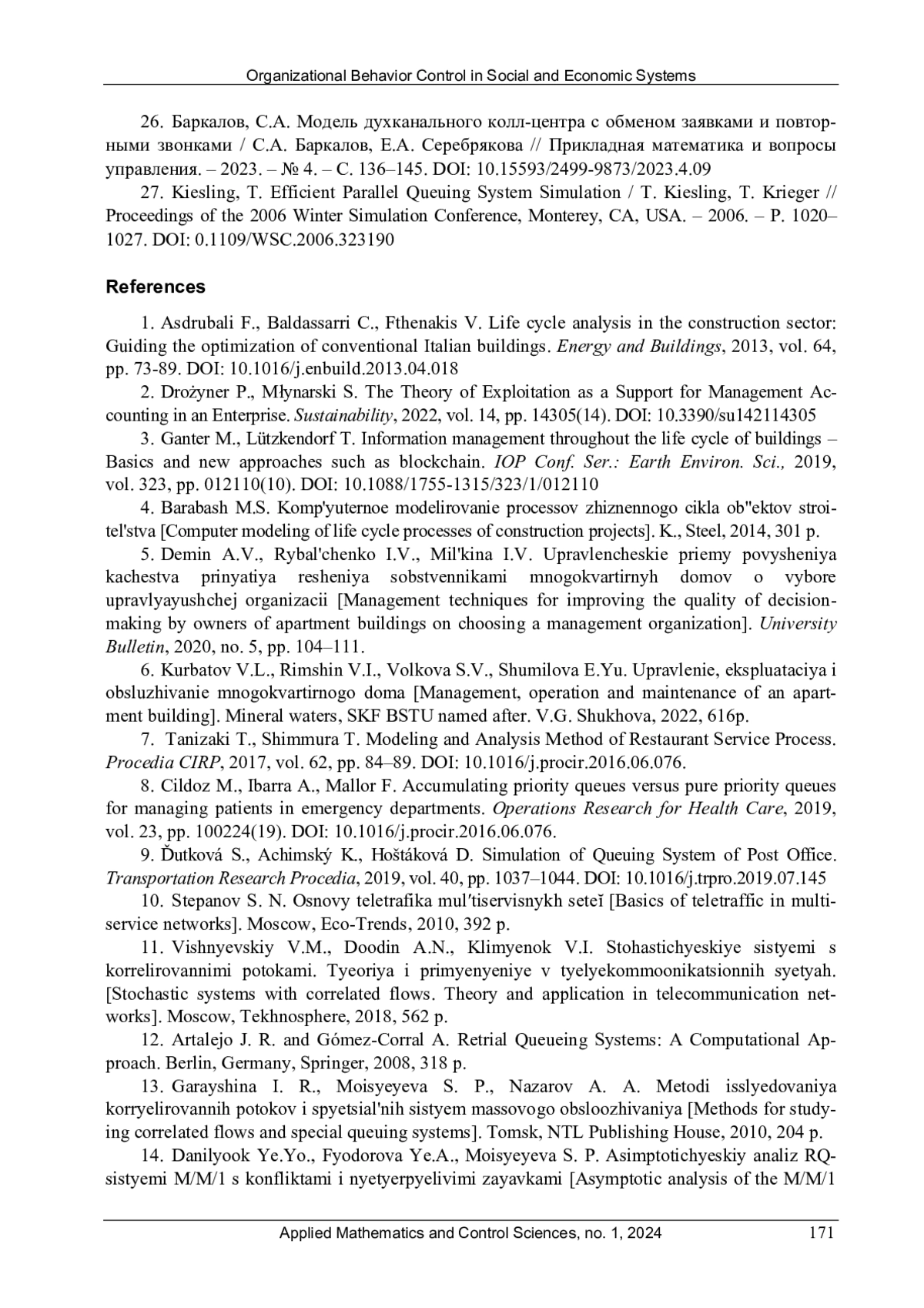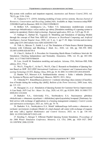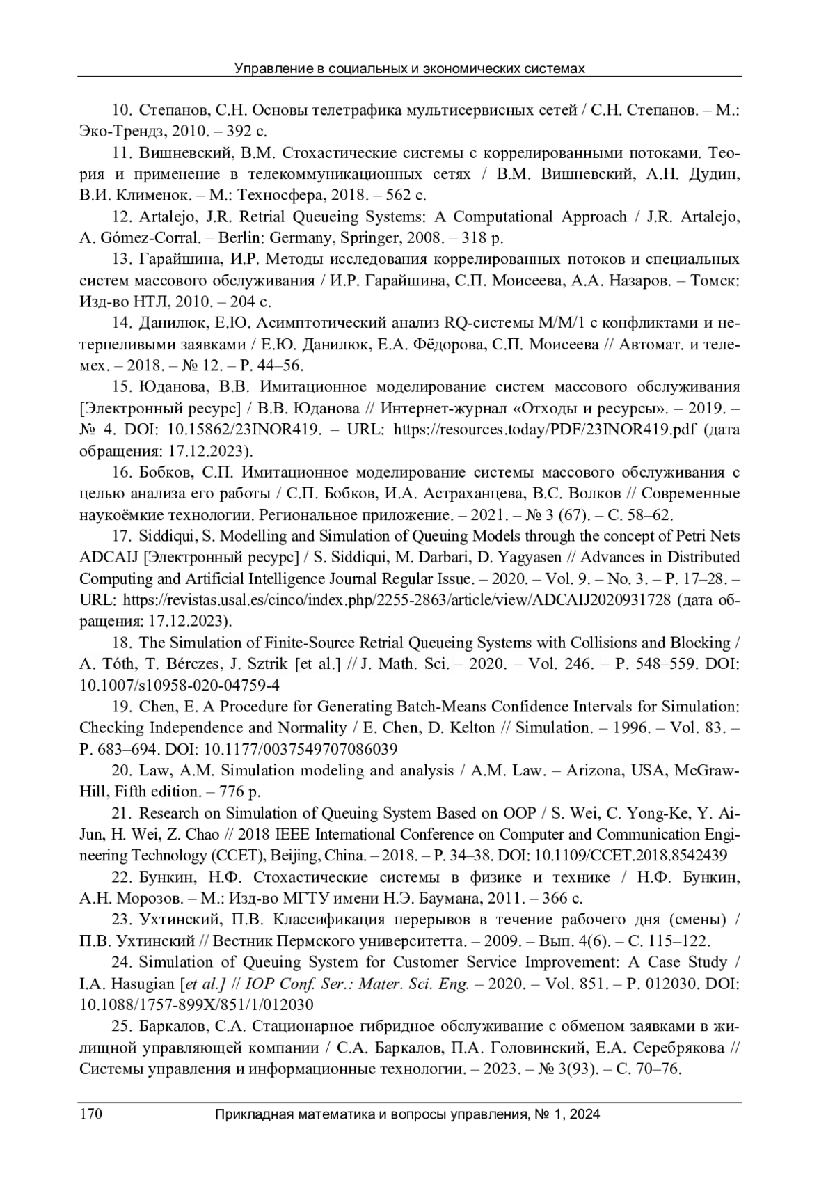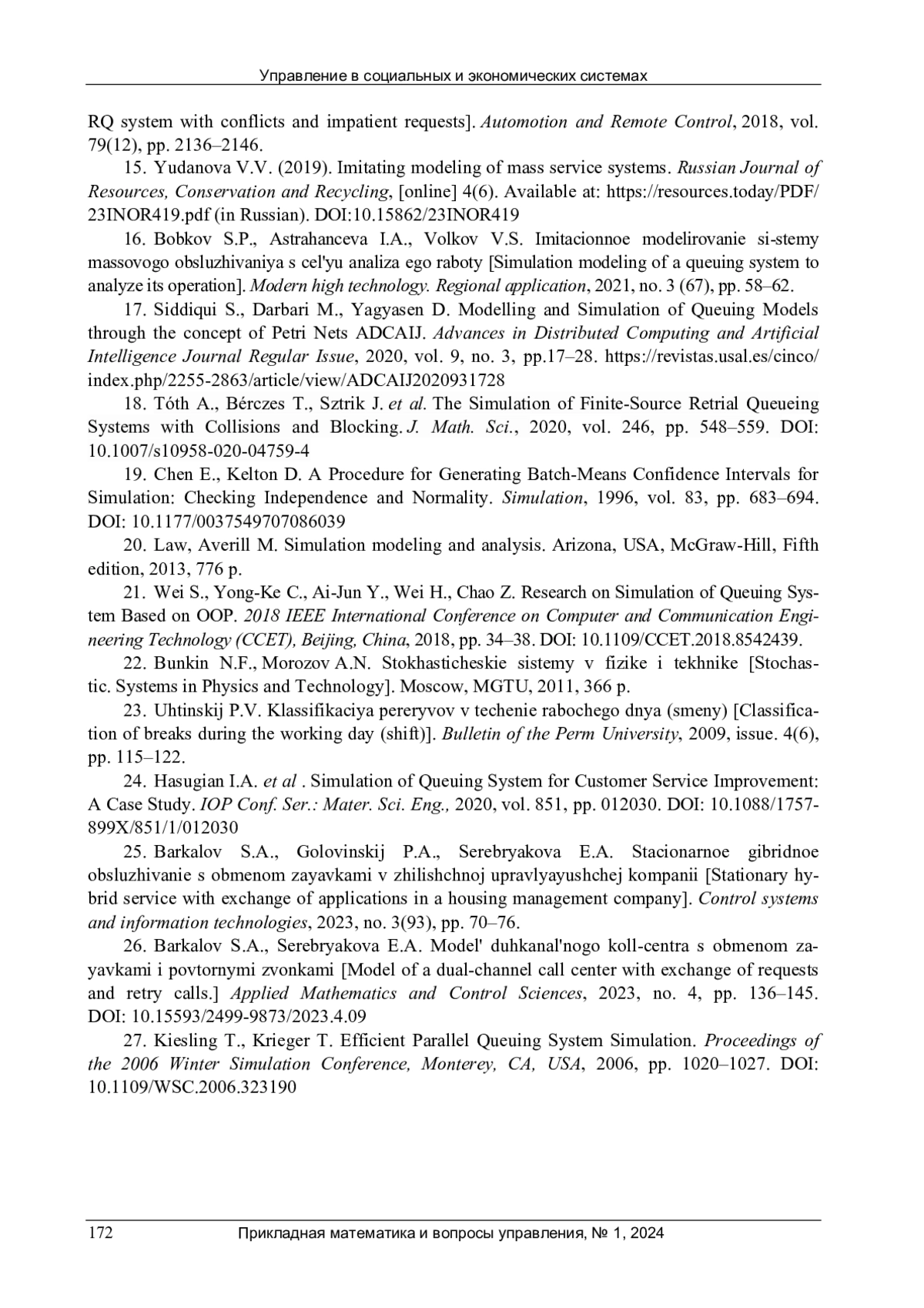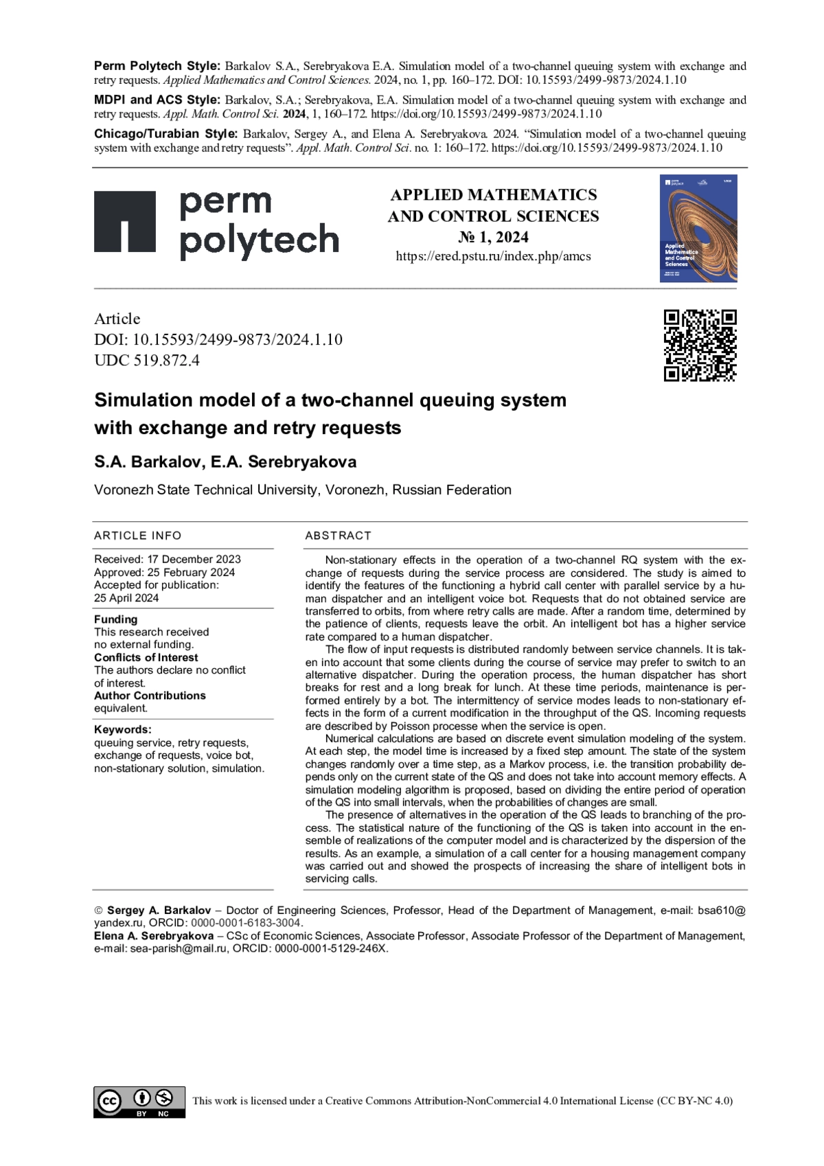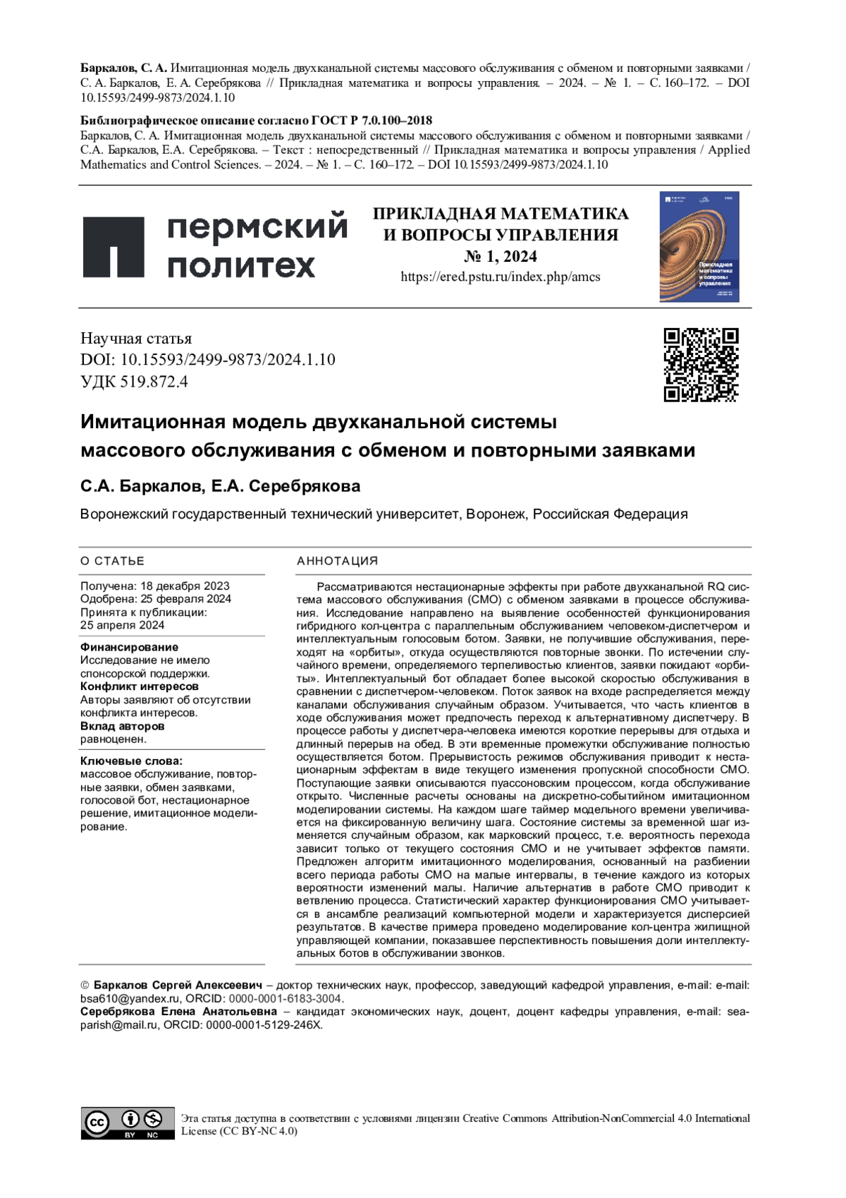 БАРКАЛОВ С. А., СЕРЕБРЯКОВА Е. А. ИМИТАЦИОННАЯ МОДЕЛЬ ДВУХКАНАЛЬНОЙ СИСТЕМЫ МАССОВОГО ОБСЛУЖИВАНИЯ С ОБМЕНОМ И ПОВТОРНЫМИ ЗАЯВКАМИ // ПРИКЛАДНАЯ МАТЕМАТИКА И ВОПРОСЫ УПРАВЛЕНИЯ. 2024. № 1