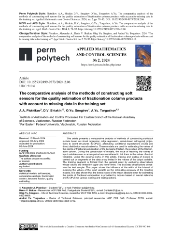 Рассматривается сравнительный анализ методов построения виртуальных анализаторов с использованием робастной регрессии, гребневой регрессии, метода ортогональных проекций на скрытые структуры на основе ядра (англ. K-OPLS), метода чередующихся условных математических ожиданий (англ. ACE) и нейросетей прямого распространения. Данные модели в составе виртуальных анализаторов предназначены для оценки значений точек фракционного состава керосиновой фракции - продукта колонны фракционирования - в режиме реального времени. В ходе построения моделей рассмотрен вопрос усреднения значений входных переменных за определенный промежуток времени для привязки к значениям выходных переменных. В отличие от существующих работ, в данном исследовании обучение и тестирование моделей осуществляется на ограниченных по значениям выходной переменной сегментах данных, т. е. в условиях пропусков данных в обучающей выборки. Показано влияние ширины интервала усреднения значений входной переменной на точность оценки получаемых моделей. Также показано, что наименьшее значение средней абсолютной ошибки при оценке точек фракционного состава обеспечивают модели на основе нейронных сетей и K-OPLS при различных вариантах обучения и тестирования.