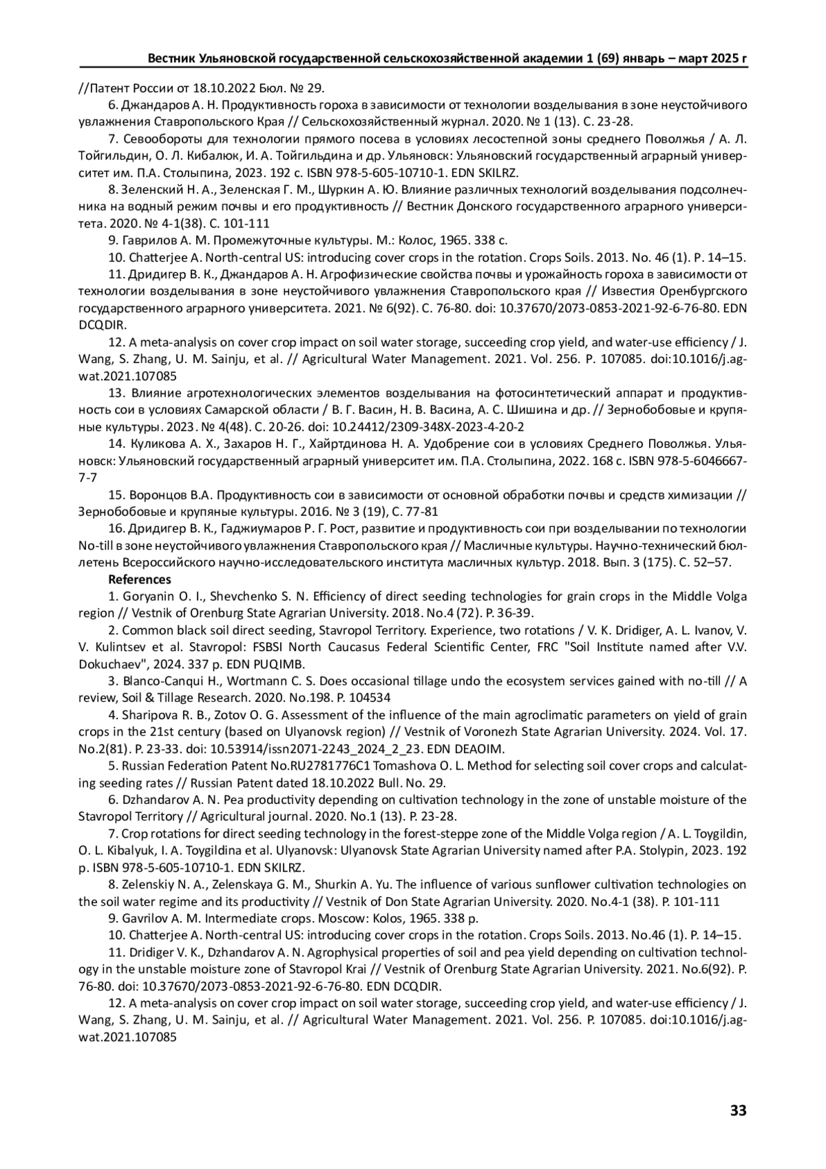 11. Дридигер В. К., Джандаров А. Н. Агрофизические свойства почвы и урожайность гороха в зависимости от технологии возделывания в зоне неустойчивого увлажнения Ставропольского края // Известия Оренбургского государственного аграрного университета. 2021. № 6(92). С. 76-80. DOI: 10.37670/2073-0853-2021-92-6-76-80 EDN: DCQDIR