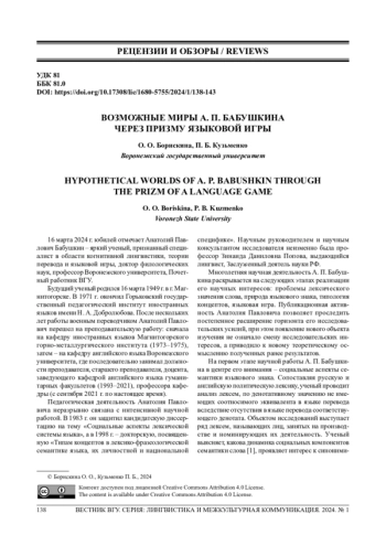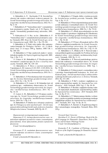 16. Бабушкин А. П. Еще раз о “двойной” языковой игре // Филология на стыке научных эпох: сб. ст. пам. д-ра филол. наук, проф. Анатолия Михайловича Ломова. Воронеж, 2020. С. 48-57.