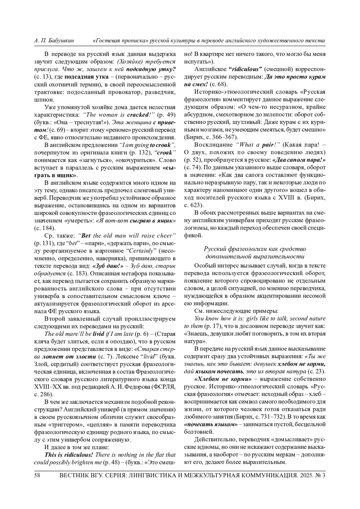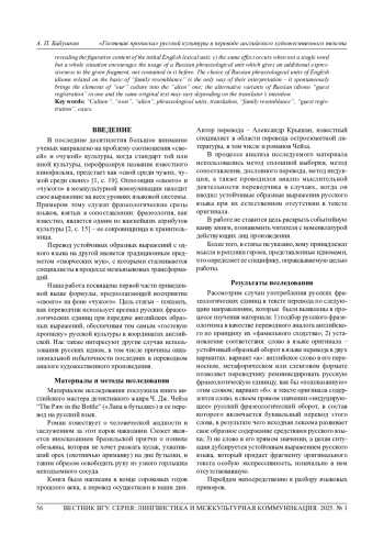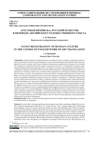 Статья посвящена употреблению русских фразеологизмов в процессе перевода английского текста, вносящих элементы «своей» культуры в «чужое» художественное пространство. Как известно, фразеологические единицы любого языка являются важнейшими атрибутами культуры. В них находит свое отражение историческая помять народа, содержатся аллюзии к его традициям и обычаям, выражаются нравственные ориентиры прошлого и настоящего. В статье рассматривается подбор русского образного выражения вместо той или иной английской идиомы по принципу выявления между ними «фамильного сходства». Кроме того, изучаются другие варианты использования устойчивых оборотов русского языка, а именно: а) употребление вместо английского универба, представленного в виде метафоры, сленгизма или жаргонизма, при этом слово в своем переносном значении воспринимается в качестве намека на вводимую переводчиком фразеологическую единицу; б) обращение к образному выражению русского языка вместо английского слова в его прямом значении, если перевод этого слова включается в состав «подходящего по смыслу» русского фразеологизма. В этом случае переводчик домысливает русскую ФЕ до полного ее состава, как бы раскрывая образное содержание исходной лексической единицы; в) тот же эффект имеет место, когда не слово, а целая ситуация в тексте оригинала подталкивает к употреблению русского фразеологизма, который придает данному фрагменту текста дополнительную экспрессивность, ранее в нем отсутствовавшую. Подбор русских фразеологических единиц вместо английских идиом по принципу «фамильного сходства», осуществляемый в процессе перевода, является, на наш взгляд, единственно возможным - он непроизвольно вносит элементы «своей» культуры в «чужую; другие варианты «гостевой прописки» русских ФЕ в одном и том же тексте языка оригинала могут разниться в зависимости от замысла переводчика.