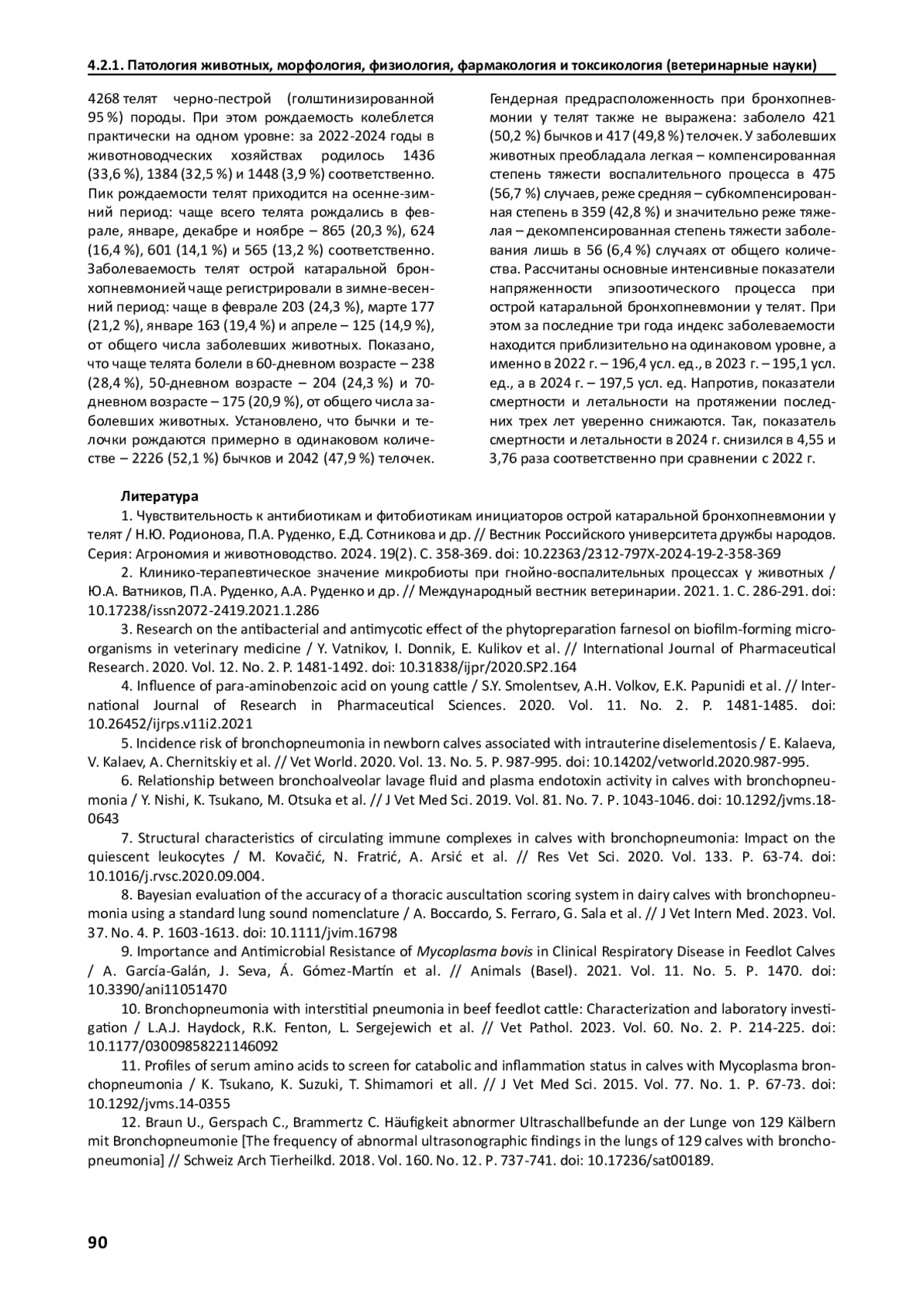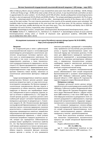 Статья: ЭПИЗООТОЛОГИЧЕСКИЙ АНАЛИЗ ЗАБОЛЕВАЕМОСТИ ТЕЛЯТ ОСТРОЙ КАТАРАЛЬНОЙ БРОНХОПНЕВМОНИЕЙ (2025)