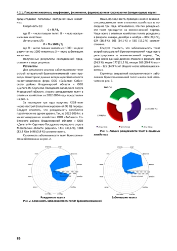 Работу выполняли с целью проведения эпизоотологического анализа заболеваемости телят острой катаральной бронхопневмонией. Объектом исследования служили телята в возрасте 1…3 мес., больные острой катаральной бронхопневмонией. На основании проведенных клинико-лабораторных исследований установлены три степени тяжести острой катаральной бронхопневмонии у телят: компенсированная, субкомпенсированная и декомпенсированная. За последние три года получено 4268 телят черно-пестрой породы. При этом рождаемость колеблется практически на одном уровне: за 2022-2024 гг. в животноводческих хозяйствах родилось 1436 (33,6 %), 1384 (32,5 %) и 1448 (3,9 %) соответственно. Пик рождаемости телят приходится на осенне-зимний период: чаще всего телята рождались в феврале, январе, декабре и ноябре. Заболеваемость телят острой катаральной бронхопневмонией чаще регистрировали в зимне-весенний период: чаще в феврале, марте, январе и апреле. Показано, что чаще телята болели в 60-дневном - 28,4 %, 50-дневном - 24,3 % и 70-дневном возрасте -20,9 %, от общего числа заболевших животных. Установлено, что бычки и телочки рождаются примерно в одинаковом количестве - 52,1 % бычков и 47,9 % телочек. Гендерная предрасположенность при бронхопневмонии у телят также не выражена: заболело 50,2 % бычков и 49,8 % телочек. У заболевших животных преобладала компенсированная степень в 56,7 % случаев, реже - субкомпенсированная в 42,8 % и значительно реже - декомпенсированная степень тяжести заболевания лишь в 6,4 % случаях от общего количества. Рассчитаны основные интенсивные показатели напряженности эпизоотического процесса. При этом за последние три года индекс заболеваемости находится приблизительно на одинаковом уровне. Напротив, показатели смертности и летальности на протяжении последних трех лет уверенно снижаются. Так, показатель смертности и летальности в 2024 г. снизился в 4,55 и 3,76 раза соответственно, при сравнении с 2022 г.