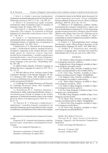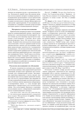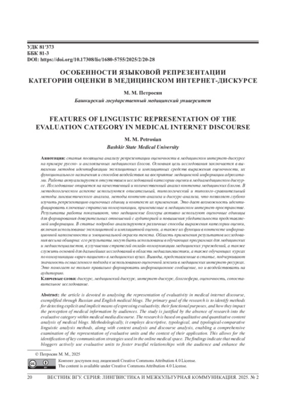 Статья посвящена анализу репрезентации оценочности в медицинском интернет-дискурсе на примере русско- и англоязычных медицинских блогов. Основная цель исследования заключается в выявлении методов идентификации эксплицитных и имплицитных средств выражения оценочности, их функционального назначения и способов воздействия на восприятие медицинской информации адресатами. Работа актуализируется отсутствием исследований категории оценки в медиамедицинском дискурсе. Исследование опирается на качественный и количественный анализ контента медицинских блогов. В методологическом аспекте используются описательный, типологический и типолого-сравнительный методы лингвистического анализа, методы контент-анализа и дискурс-анализа, что позволяет глубоко изучить репрезентацию оценочных единиц и контекст их применения. Это дает возможность идентифицировать ключевые стратегии коммуникации, применяемые в медицинском интернет-пространстве. Результаты работы показывают, что медицинские блогеры активно используют оценочные единицы для формирования доверительных отношений с аудиторией и повышения убедительности представляемой информации. В статье подробно анализируются различные способы выражения категории оценки, включая использование эксплицитной и имплицитной оценки, а также их функции в контексте информационной наполненности и эмоциональной окраски текста. Область применения результатов исследования весьма обширна: его результаты могут быть использованы в обучающих программах для медицинских и медиаспециалистов, в улучшении стратегий онлайн-коммуникации медицинских учреждений, а также служить основой для дальнейших исследований в области медиалингвистики, а также обучающих курсах по коммуникации «врач-пациент» в медицинских вузах. Выводы, представленные в статье, подчеркивают значимость осмысленного подхода к использованию оценочной лексики в медицинских интернет-ресурсах. Это помогает не только правильно формировать информационное сообщение, но и воздействовать на аудиторию.