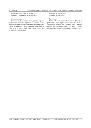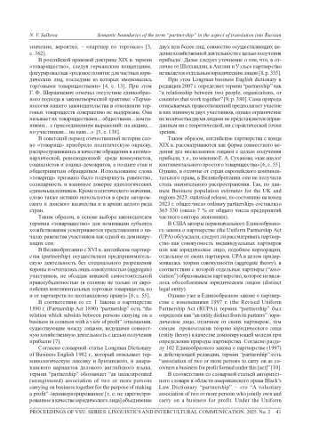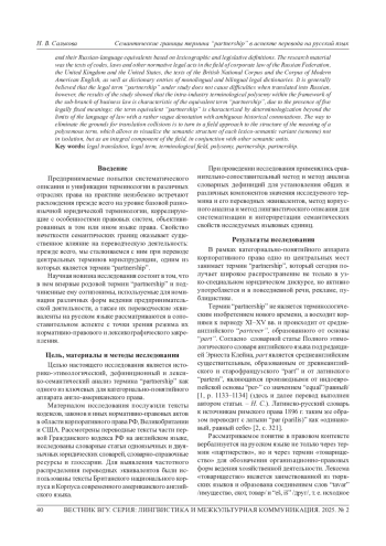 Статья имеет целью историко-этимологический, дефиниционный и лексико-семантический анализ термина “partnership” как одного из ключевых для категориально-понятийного аппарата англоамериканского права. Автором рассматриваются случаи применения указанного термина для номинации различных форм ведения хозяйственной деятельности и его перевода на русский язык в целях обеспечения адекватного понимания участниками профессиональной коммуникации. В статье анализируется семный состав родового термина (гиперонима) “partnership”, подчиненных ему согипонимов и их русскоязычных эквивалентов на основе лексикографических и законодательных дефиниций. Материалом исследования послужили тексты кодексов, законов и иных нормативно-правовых актов в области корпоративного права РФ, Великобритании и США, тексты Британского национального корпуса и Корпуса современного американского английского языка, а также словарные статьи одноязычных и двуязычных юридических словарей. Принято считать, что исследуемый юридический термин “partnership” не вызывает трудностей при переводе на русский язык, однако результаты исследования показали, что для рассматриваемого в качестве эквивалентного термина «партнерство» характерна внутриотраслевая терминологическая полисемия в рамках подотрасли предпринимательского права; для термина-эквивалента «товарищество» характерна детерминологизированность вне пределов языка права при достаточно расплывчатом денотате с неоднозначными историческими коннотациями. Способом устранения оснований для переводческих коллизий видится обращение к полевому подходу к структуре значения многозначного термина, который позволяет наглядно представить семантическую структуру каждого лексикосемантического варианта (семемы) не изолированно, а в качестве составного компонента поля, во взаимосвязи с другими семантическими единицами.