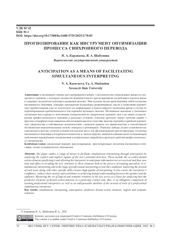 В настоящей статье рассматривается вопрос о возможности оптимизации процесса синхронного перевода с помощью механизма вероятностного прогнозирования посредством анализа явных и скрытых сигналов последующего развития текста. Эти сигналы могут представлять собой элементы дистантного действия, которые проецируют дальнейшее развертывание мысли и позволяют переводчику предвосхищать еще не полученную им информацию и таким образом экономить время и усилия по перекодированию предназначенного для перевода звучащего текста. Постоянное внимание к указанным элементам как в процессе подготовки специалистов по синхронному переводу, так и на этапе осуществления профессионального перевода в реальных условиях, освоение арсенала таких средств наряду с другими специфическими навыками обеспечивает высокое качество текста перевода и придает переводчику уверенность в собственных возможностях, снижает уровень его тревожности и способствует достижению взаимопонимания между спикером и аудиторией. Освоение набора логико-семантических отношений в тексте служит основой для анализа того, как функционируют прогнозирующие элементы дистантного действия в конкретном контексте и, таким образом, является обязательной составляющей подготовки переводчиков-синхронистов и непременным атрибутом арсенала средств профессионального синхрониста.