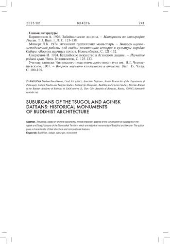 ЖАМСУЕВА Д. С. СУБУРГАНЫ ЦУГОЛЬСКОГО И АГИНСКОГО ДАЦАНОВ: ИСТОРИЧЕСКИЕ ПАМЯТНИКИ БУДДИЙСКОЙ АРХИТЕКТУРЫ // ВЛАСТЬ. 2025. ТОМ 33 № 2