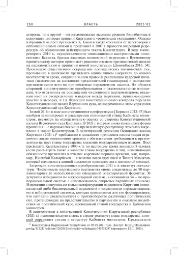 2. Борисов Н.А. 2022. Президенциализация формы правления в Кыргызстане как фактор политического процесса: причины и перспективы. - Журнал политических исследований. Т. 6. № 4. С. 44-57. DOI: 10.12737/2587-6295-2022-6-4-44-57 EDN: QVIEAH