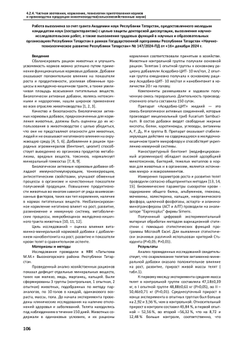Цель исследования - изучить влияние наноструктурного бентонита на рост, развитие, физиологический статус и биохимические показатели крови телят. Исследование проведено в Республике Татарстан. Объектами исследований были телята черно-пестрой породы, отобранные по принципу аналогов, которые были разделены на 3 группы (контрольная и 2 опытные) по 10 животных в каждой. Животные содержались в одинаковых условиях, и их рационы кормления соответствовали принятым в хозяйстве. Контрольная группа получала основной рацион. Первой опытной группе телят к основному рациону добавляли АсидоБио-ЦИТ- 10 мл/гол. Вторая опытная группа ежедневно получала к основному рациону АсидоБио-ЦИТ -10 мл/гол и нанобентонит в количестве 20 грамм на голову. К первому месяцу эксперимента средняя масса телят в контрольной группе составляла 47,18±0,39 кг, в первой опытной группе 48,88±0,61 кг (Р>0,05), во второй -50,46±0,71 кг (Р>0,01). Относительный прирост в контроле составил 43,84 %, в первой опытной - 52,56 %, во второй опытной группе - 56,32 %, что на 8,72 и 12,48 % больше контроля соответственно. Лучшие показатели по снижению ферментов печени АЛТ также были во 2 опытной группе - на 54,16 % (Р>0,05).