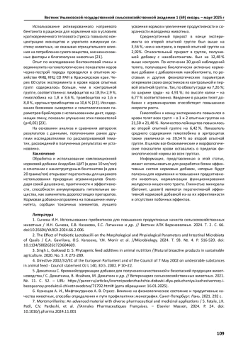 1. Сычева И.Н. Использование пробиотиков для повышения продуктивных качеств сельскохозяйственных животных / И.Н. Сычева, Е.В. Казакова, Е.С. Латынина и др. // Вестник АПК Верхневолжья. 2024. Т. 2. С. 66. DOI: 10.35694/YARCX.2024.66.2.006 EDN: LDVTLX