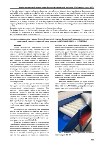 Задача качественной очистки корнеплодов от почвы актуальна как при уборке, так и при их подготовке к скармливанию животным. Наиболее востребованы в настоящее время машины для сухой очистки корнеплодов со щеточными рабочими органами. К недостаткам таких машин можно отнести повышенную травмируемость клубней при улучшении качества очистки. Цель исследований - изучение особенности кинематики клубней картофеля в инновационном очистителе корнеплодов для последующей оптимизации режимов его работы. Очистка клубней в машине происходит за счет вращения соседних роликов с разной частотой. При этом клубни за счет проскальзывания по поверхности роликов очищаются от налипшей на них почвы. В результате проведенных лабораторных исследований получена адекватная зависимость окружной скорости наружной поверхности клубня 0)0 от окружных скоростей нечетных и четных роликов. Выявлено, что примерно на 77 % зависит от окружной скорости ролика, вращающегося с большей частотой и только на 9,2 % - от окружной скорости соседнего ролика. Линейная скорость перемещения клубней по вращающимся дискам первой ступени рабочего органа на оптимальном режиме работы очистителя составляет 0,064 м/с, что в среднем в 7,5 раза меньше окружной скорости клубней, а скорость движения клубней по фигурным роликам второй ступени, которая равна 0,082 м/c, в среднем в 12,3 раза меньше окружной скорости клубней. Определено, что при частоте вращения смежных фигурных роликов 250 мин-1 и 220 мин-1 можно довести эффективность очистки клубней картофеля до 78 %.