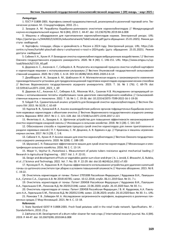 5. Сабиев У. К., Хузин И. Р. Безводная очистка корнеклубнеплодов вибрационным воздействием /// Вестник Омского государственного аграрного университета. 2020. № 4 (40). С. 146-151. URL: https://www.omgau.ru/up-load/iblock/b27/19_40.pdf. EDN: TPZTFP