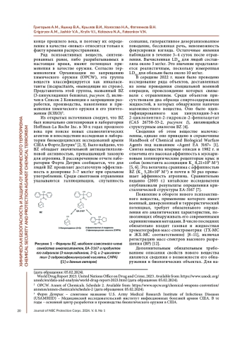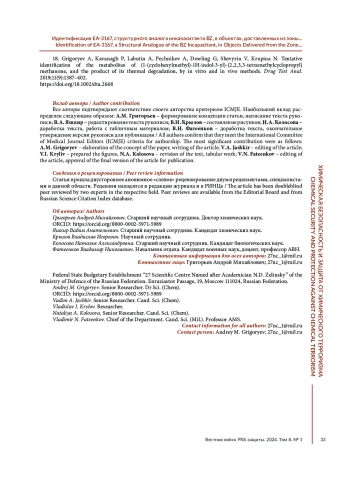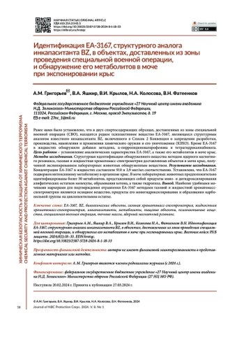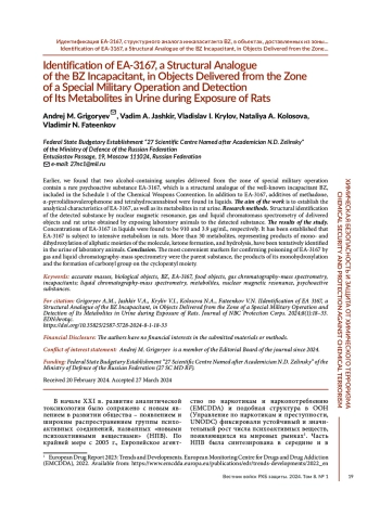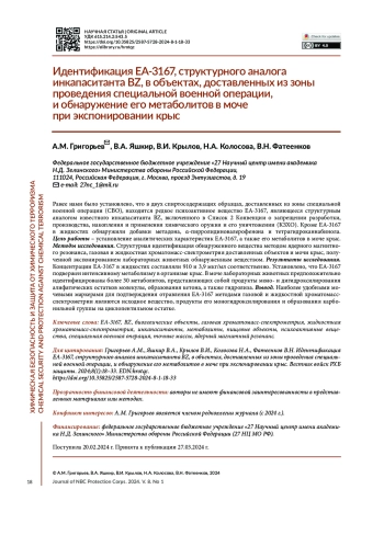 ГРИГОРЬЕВ А. М., ЯШКИР В. А., КРЫЛОВ В. И., КОЛОСОВА Н. А., ФАТЕЕНКОВ В. Н. ИДЕНТИФИКАЦИЯ EA-3167, СТРУКТУРНОГО АНАЛОГА ИНКАПАСИТАНТА BZ, В ОБЪЕКТАХ, ДОСТАВЛЕННЫХ ИЗ ЗОНЫ ПРОВЕДЕНИЯ СПЕЦИАЛЬНОЙ ВОЕННОЙ ОПЕРАЦИИ, И ОБНАРУЖЕНИЕ ЕГО МЕТАБОЛИТОВ В МОЧЕ ПРИ ЭКСПОНИРОВАНИИ КРЫС // ВЕСТНИК ВОЙСК РХБ ЗАЩИТЫ. 2024. ТОМ 8 №1