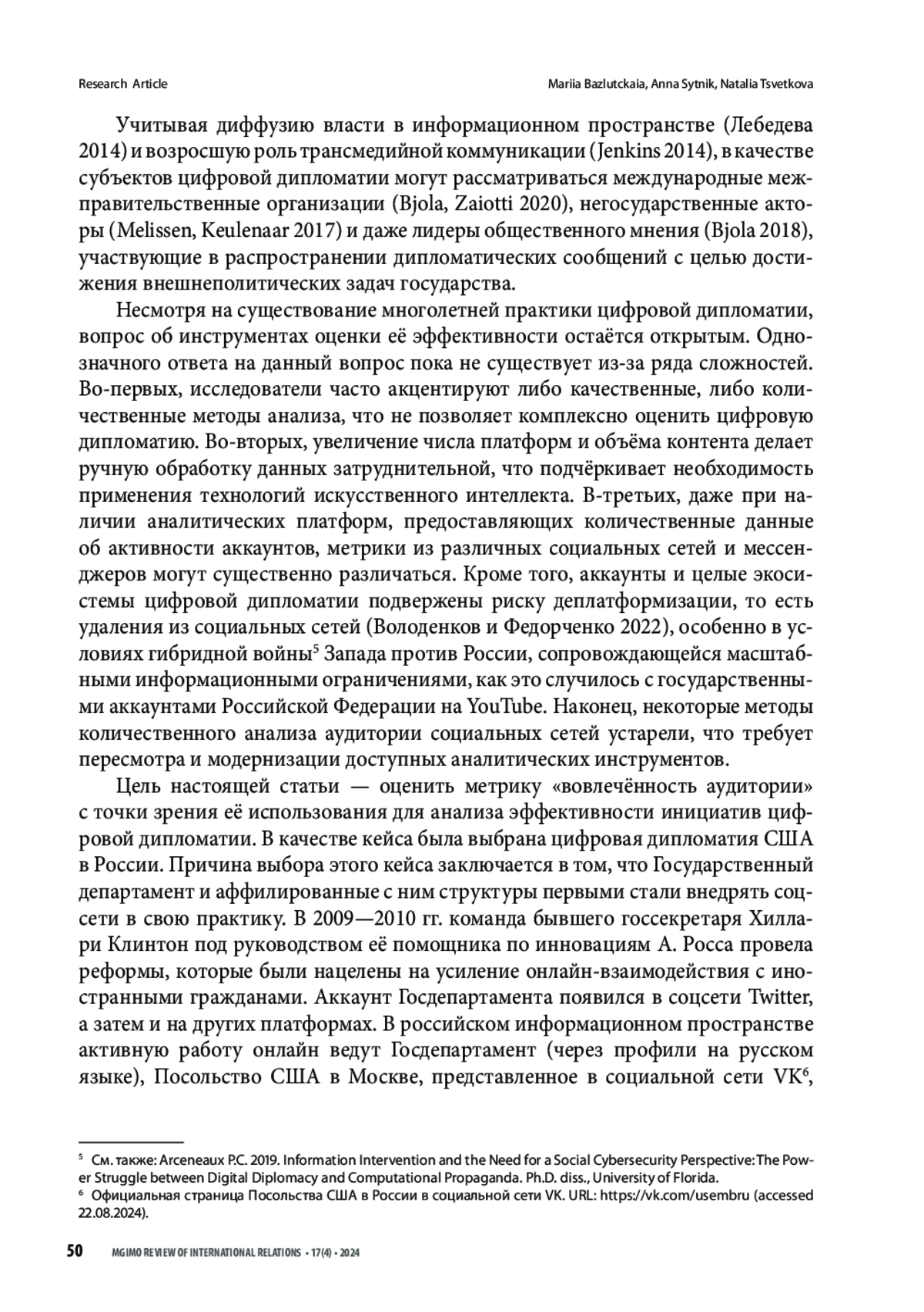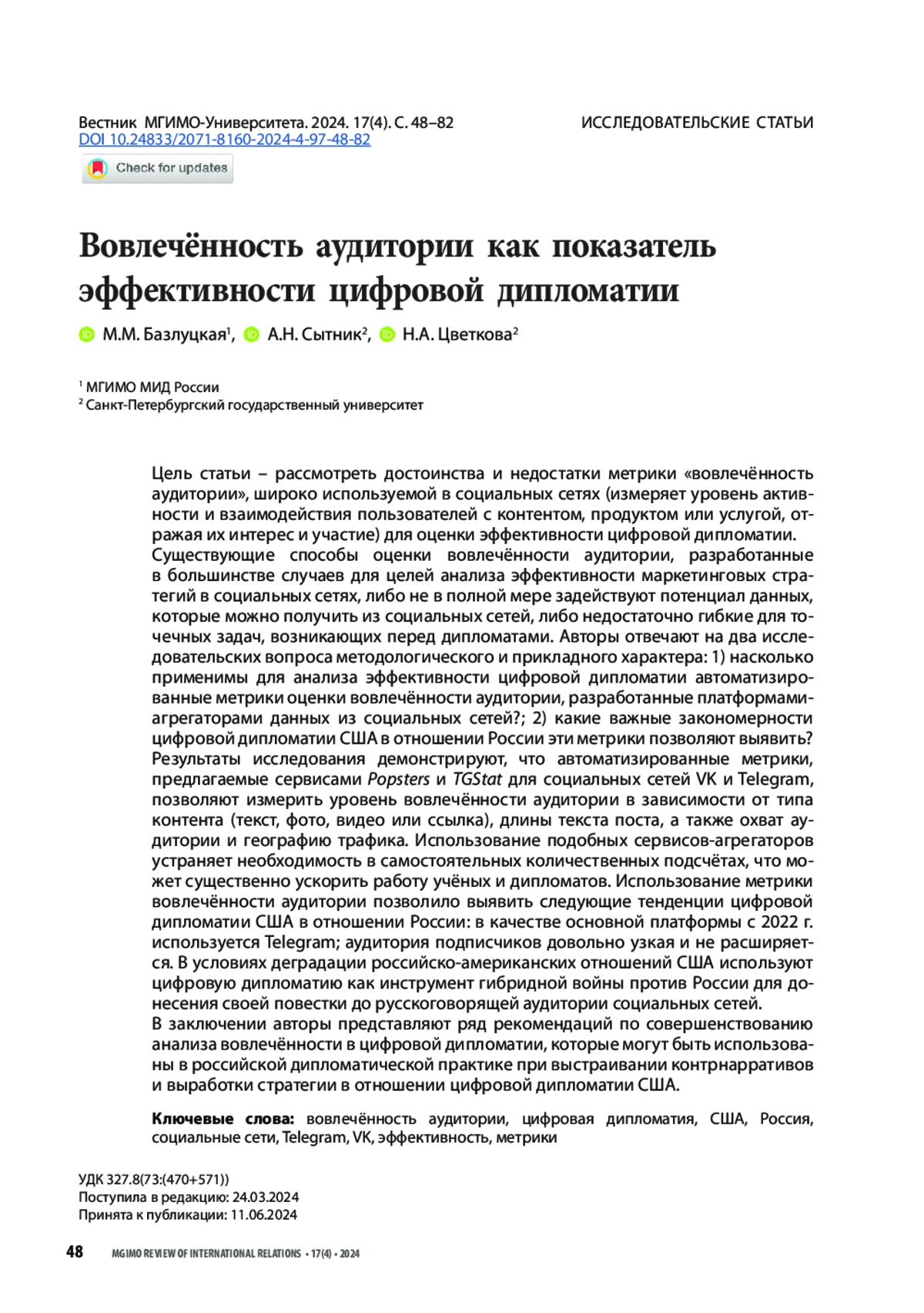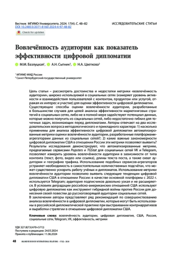 БАЗЛУЦКАЯ М. М., СЫТНИК А. Н., ЦВЕТКОВА Н. А. ВОВЛЕЧЕННОСТЬ АУДИТОРИИ КАК ПОКАЗАТЕЛЬ ЭФФЕКТИВНОСТИ ЦИФРОВОЙ ДИПЛОМАТИИ // ВЕСТНИК МГИМО-УНИВЕРСИТЕТА. 2024. ТОМ 17, № 4