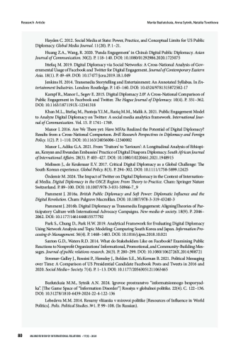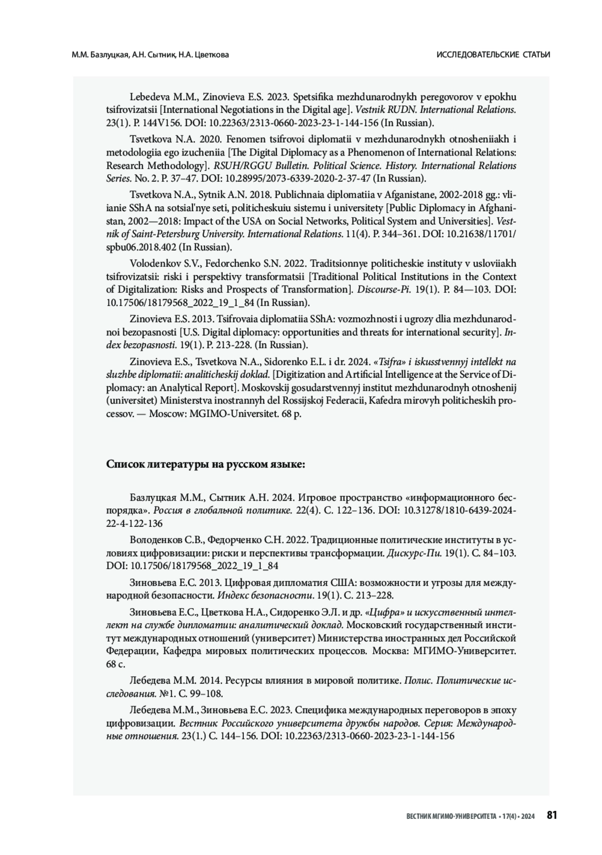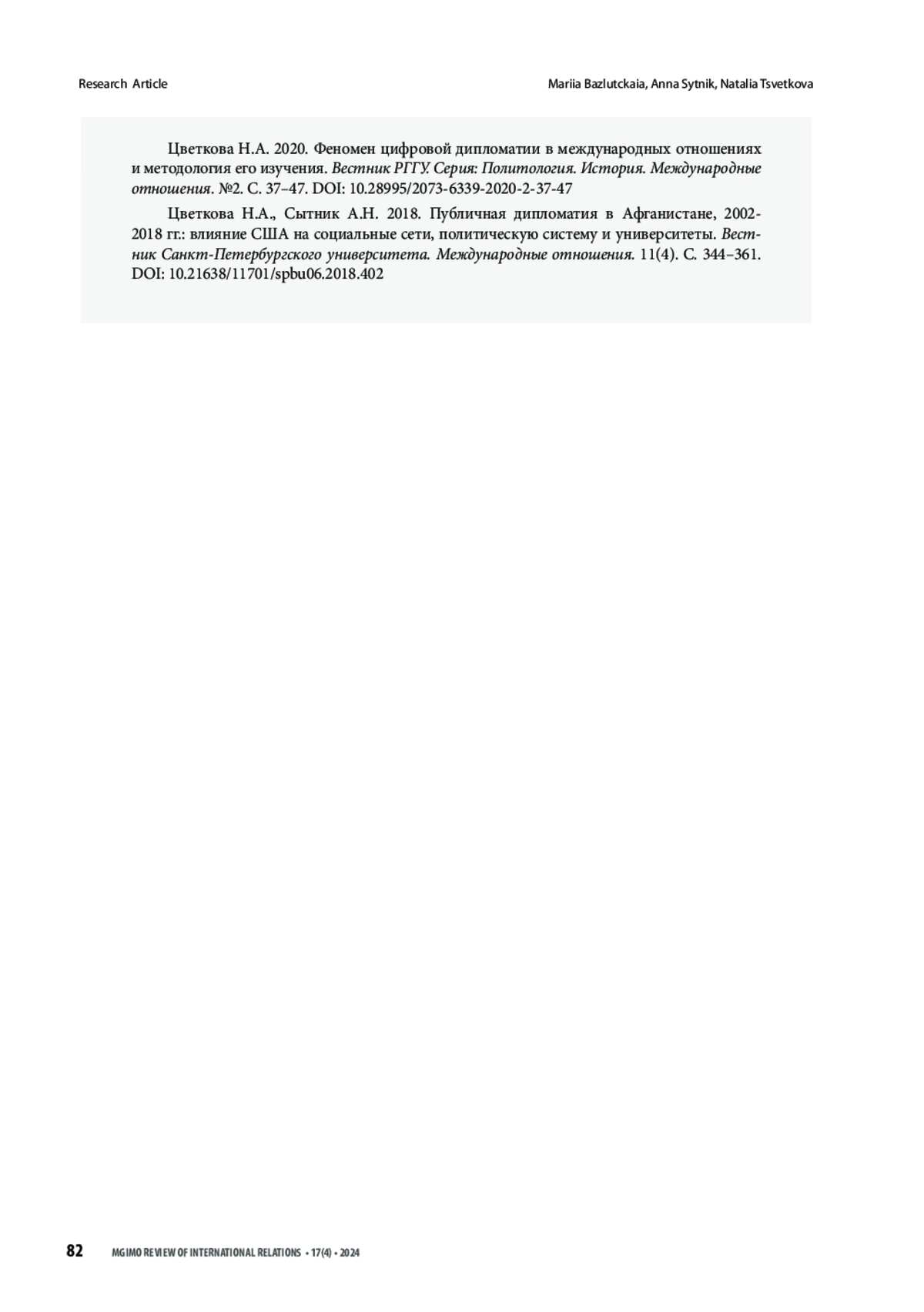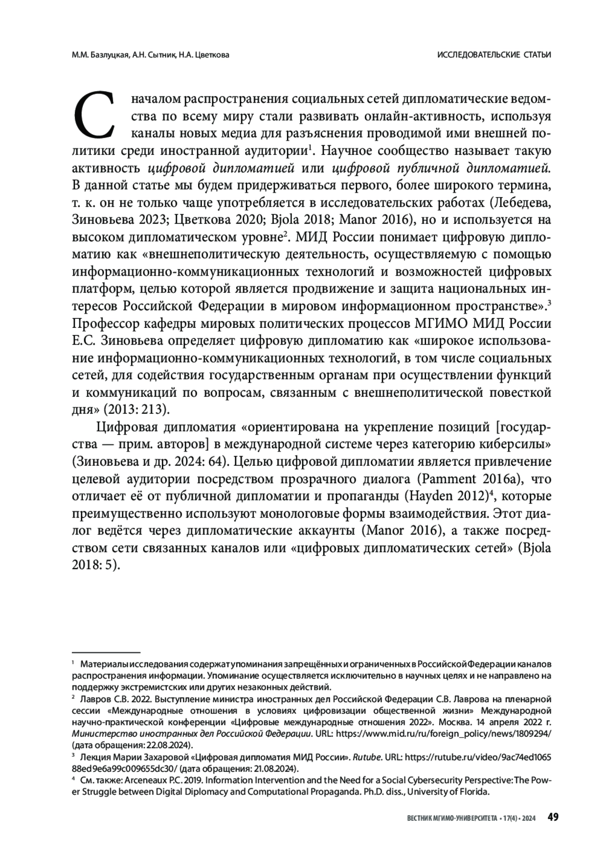БАЗЛУЦКАЯ М. М., СЫТНИК А. Н., ЦВЕТКОВА Н. А. ВОВЛЕЧЕННОСТЬ АУДИТОРИИ КАК ПОКАЗАТЕЛЬ ЭФФЕКТИВНОСТИ ЦИФРОВОЙ ДИПЛОМАТИИ // ВЕСТНИК МГИМО-УНИВЕРСИТЕТА. 2024. ТОМ 17, № 4