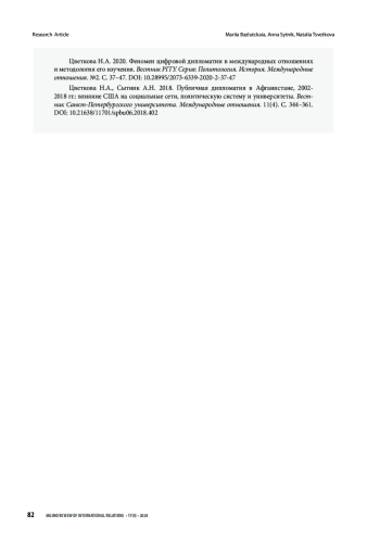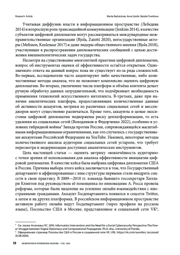 Цель статьи – рассмотреть достоинства и недостатки метрики «вовлеченности аудитории», широко используемой в социальных сетях (измеряет уровень активности и взаимодействия пользователей с контентом, продуктом или услугой, отражая их интерес и участие), для оценки эффективности цифровой дипломатии. Существующие способы оценки вовлеченности аудитории, разработанные в большинстве случаев для целей анализа эффективности маркетинговых стратегий в социальных сетях, либо не в полной мере задействуют потенциал данных, которые можно получить из социальных сетей, либо недостаточно гибкие для точечных задач, возникающих перед дипломатами. Авторы отвечают на два исследовательских вопроса методологического и прикладного характера: 1) насколько применимы для анализа эффективности цифровой дипломатии автоматизированные метрики оценки вовлеченности аудитории, разработанные платформами-агрегаторами данных из социальных сетей?; 2) какие важные закономерности цифровой дипломатии США в отношении России эти метрики позволяют выявить? Результаты исследования демонстрируют, что автоматизированные метрики, предлагаемые сервисами Popsters и TGStat для социальных сетей VK и Telegram, позволяют измерить уровень вовлеченности аудитории в зависимости от типа контента (текст, фото, видео или ссылка), длины текста поста, а также охват аудитории и географию трафика. Использование подобных сервисов-агрегаторов устраняет необходимость в самостоятельных количественных подсчётах, что может существенно ускорить работу учёных и дипломатов. Использование метрики вовлеченности аудитории позволило выявить следующие тенденции цифровой дипломатии США в отношении России: в качестве основной платформы с 2022 года используется Telegram; аудитория подписчиков довольно узкая и не расширяется. В условиях деградации российско-американских отношений США использует цифровую дипломатию как инструмент «гибридной войны» против России для донесения своей повестки до русскоговорящей аудитории социальных сетей. В заключении авторы представляют ряд рекомендаций по совершенствованию анализа вовлеченности в цифровой дипломатии, которые могут быть использованы в российской дипломатической практике при выстраивании контрнарративов и выработки стратегии в отношении цифровой дипломатии США.