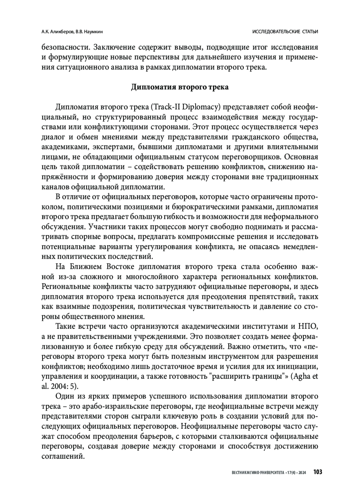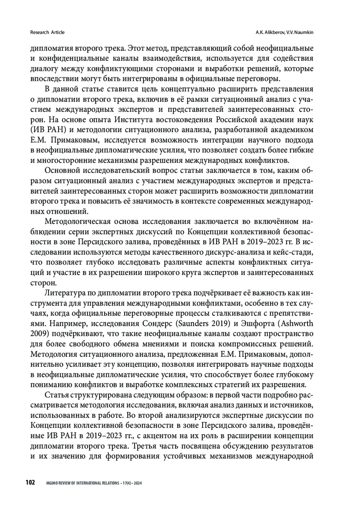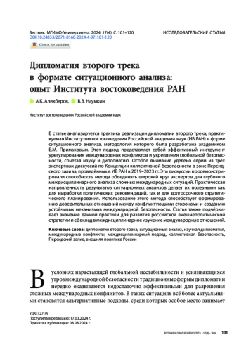 В статье анализируется практика реализации дипломатии второго трека, практикуемая Институтом востоковедения Российской академии наук (ИВ РАН) в форме ситуационного анализа, методология которого была разработана академиком Е. М. Примаковым. Этот подход представляет собой эффективный инструмент урегулирования международных конфликтов и укрепления глобальной безопасности, сочетая науку и дипломатию. Особое внимание уделено серии из трёх экспертных дискуссий по Концепции коллективной безопасности в зоне Персидского залива, проведённых в ИВ РАН в 2019–2023 гг. Эти дискуссии продемонстрировали способность метода объединять широкий круг экспертов для глубокого междисциплинарного анализа сложных международных ситуаций. Практическая направленность результатов ситуационных анализов делает их полезными как для выработки политических рекомендаций, так и для долгосрочного стратегического планирования. Использование этого метода способствует формированию доверительных отношений между конфликтующими сторонами и созданию устойчивых механизмов международной безопасности. Статья также подчёркивает значение данной практики для развития российской внешнеполитической стратегии и её вклад в междисциплинарное изучение международных отношений.