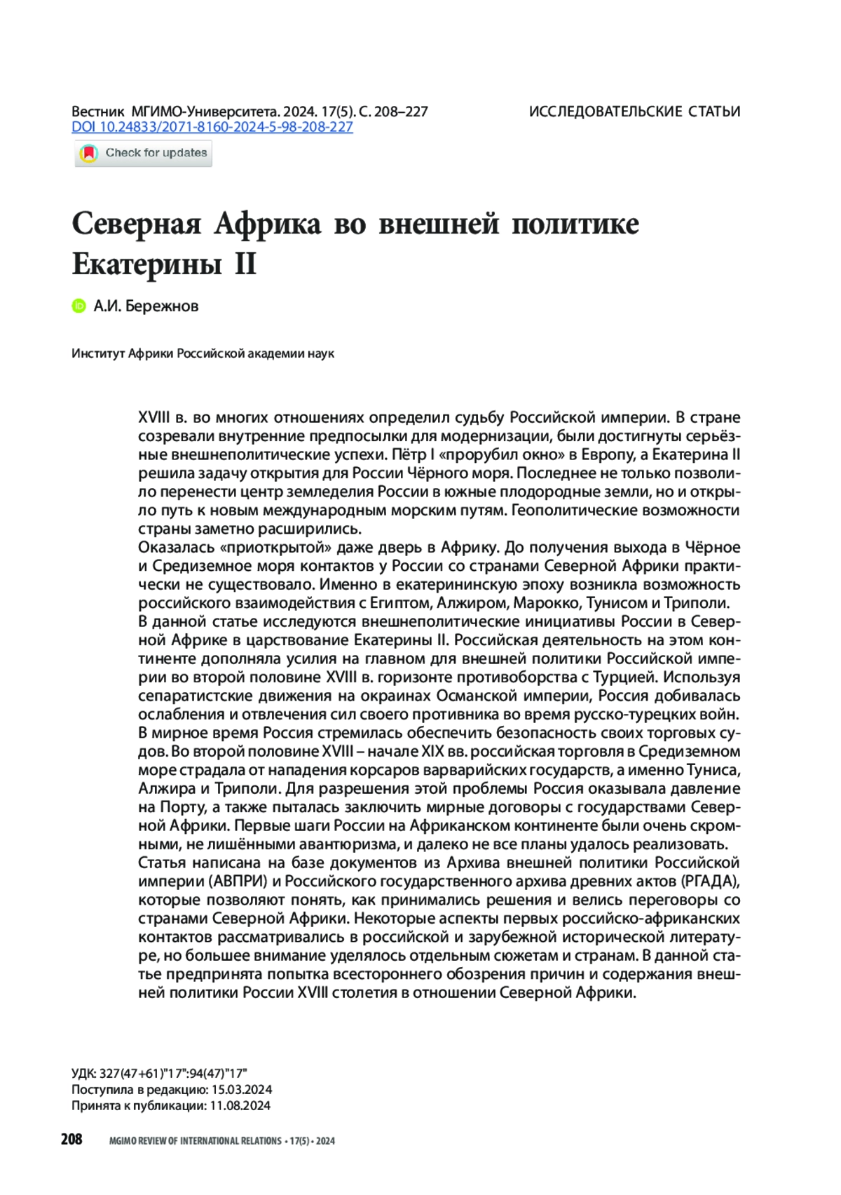 XVIII в. во многих отношениях определил судьбу Российской империи. В стране созревали внутренние предпосылки для модернизации, были достигнуты серьёзные внешнеполитические успехи. Пётр I «прорубил окно» в Европу, а Екатерина II решила задачу открытия для России Чёрного моря. Последнее не только позволило перенести центр земледелия России в южные плодородные земли, но и открыло путь к новым международным морским путям. Геополитические возможности страны заметно расширились. Оказалась «приоткрытой» даже дверь в Африку. До получения выхода в Чёрное и Средиземное моря контактов у России со странами Северной Африки практически не существовало. Именно в екатерининскую эпоху возникла возможность российского взаимодействия с Египтом, Алжиром, Марокко, Тунисом и Триполи. В данной статье исследуются внешнеполитические инициативы России в Северной Африке в царствование Екатерины II. Российская деятельность на этом континенте дополняла усилия на главном для внешней политики Российской империи во второй половине XVIII в. горизонте противоборства с Турцией. Используя сепаратистские движения на окраинах Османской империи, Россия добивалась ослабления и отвлечения сил своего противника во время русско-турецких войн. В мирное время Россия стремилась обеспечить безопасность своих торговых судов. Во второй половине XVIII – начале XIX вв. российская торговля в Средиземном море страдала от нападения корсаров варварийских государств, а именно Туниса, Алжира и Триполи. Для разрешения этой проблемы Россия оказывала давление на Порту, а также пыталась заключить мирные договоры с государствами Северной Африки. Первые шаги России на Африканском континенте были очень скромными, не лишёнными авантюризма, и далеко не все планы удалось реализовать. Статья написана на базе документов из Архива внешней политики Российской империи (АВПРИ) и Российского государственного архива древних актов (РГАДА), которые позволяют понять, как принимались решения и велись переговоры со странами Северной Африки. Некоторые аспекты первых российско-африканских контактов рассматривались в российской и зарубежной исторической литературе, но большее внимание уделялось отдельным сюжетам и странам. В данной статье предпринята попытка всестороннего обозрения причин и содержания внешней политики России XVIII столетия в отношении Северной Африки.