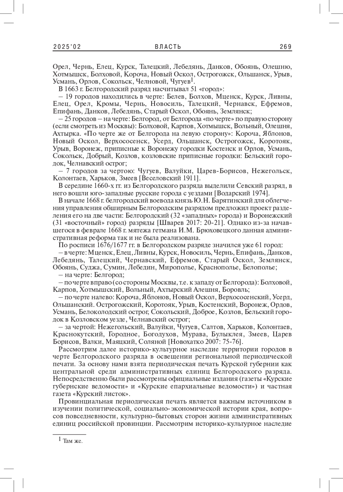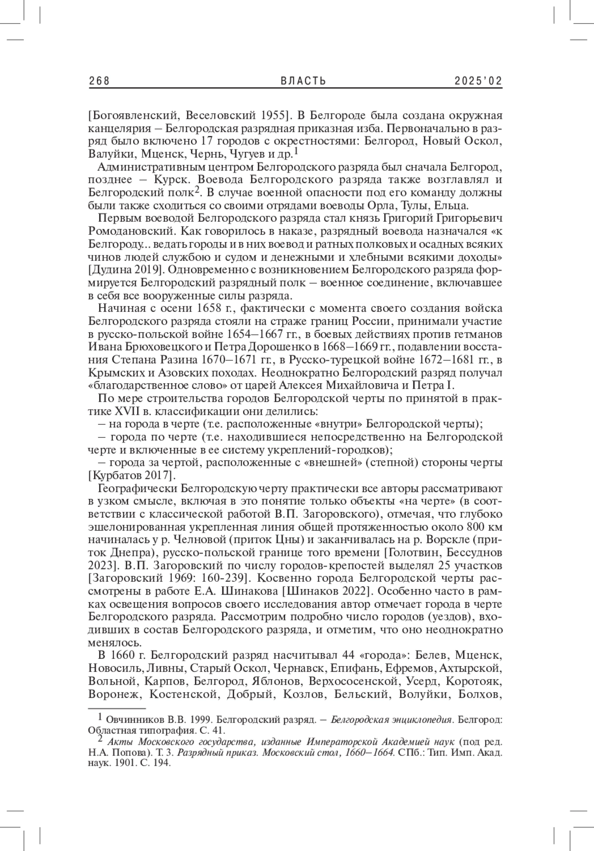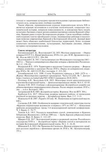 6. Дудина О.В. 2019. Создание и функционирование Белгородского разряда как административно-территориальной единицы России второй половины XVII в.: дис. … к.и.н. Белгород. 199 с. EDN: UCLEXQ