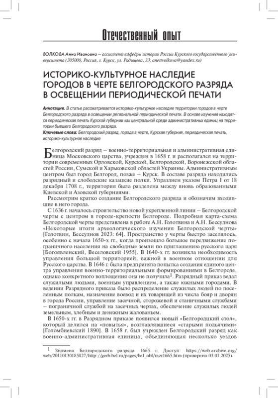 В статье рассматривается историко-культурное наследие территории городов в черте Белгородского разряда в освещении региональной периодической печати. В основе изучения находится периодическая печать Курской губернии как центральной среди административных единиц на территории бывшего Белгородского разряда.
