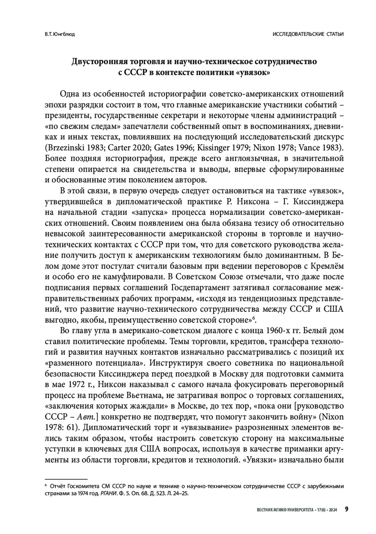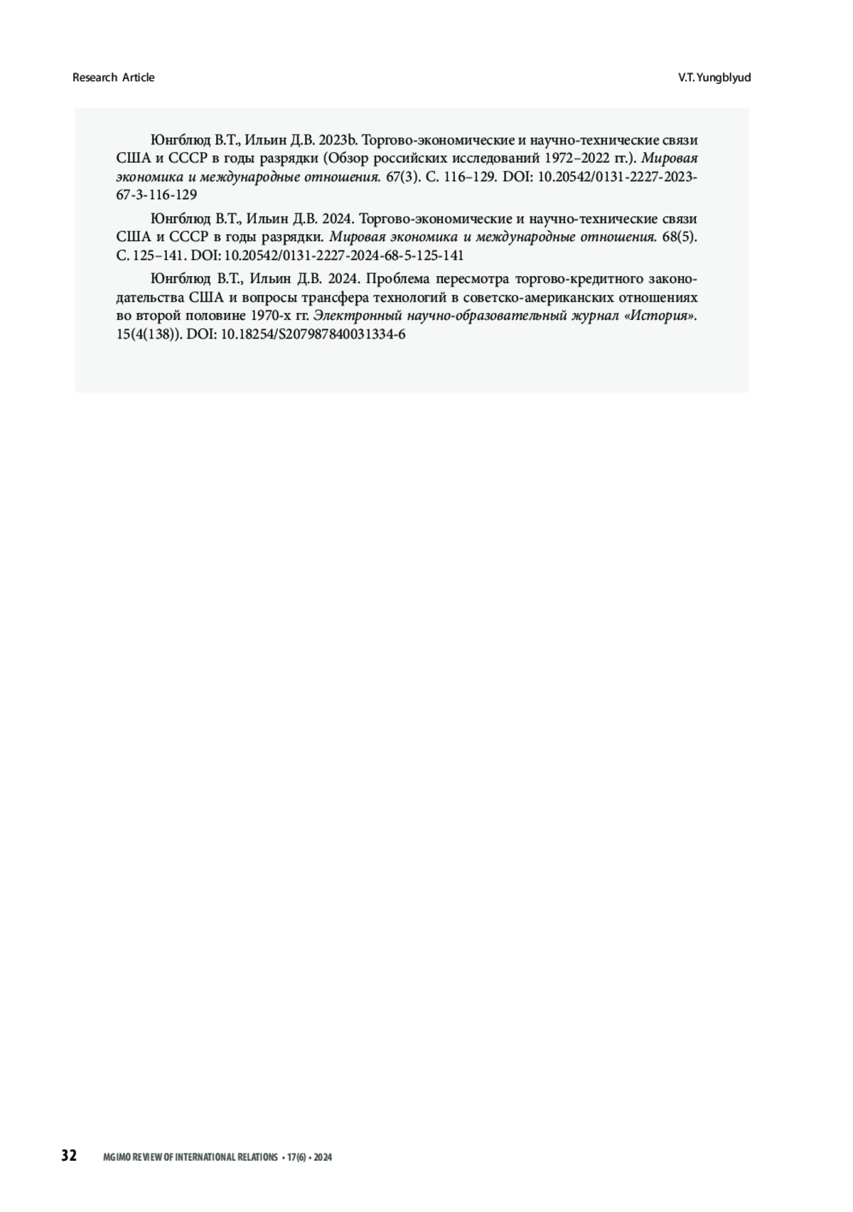 36. Юнгблюд В.Т., Ильин Д.В. 2024. Торгово-экономические и научно-технические связи США и СССР в годы разрядки. Мировая экономика и международные отношения. Т. 68. № 5. С. 125-141. https://doi.org/10.20542/0131-2227-2024-68-5-125-141
