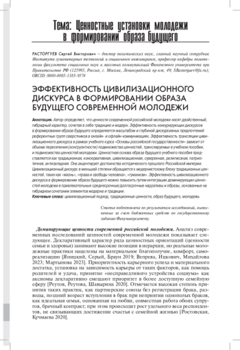 Автор определяет, что ценности современной российской молодежи носят двойственный, гибридный характер, сочетая в себе традицию и модерн. Эффективность конкурирующих дискурсов в формировании образа будущего определяется масштабом и глубиной дискурсивных предпочтений референтных групп сверстников в онлайн- и офлайн-коммуникациях. Эффективность трансляции цивилизационного дискурса в рамках учебного курса «Основы российской государственности» зависит от объема пересечения (конгруэнтности) подмножества ценностей, транслируемых в учебном пособии, и подмножества ценностей молодежи. Ценностная основа образа будущего учебного пособия представляется как традиционная, консервативная, цивилизационная, суверенная, религиозная, патриотичная, антизападная. Она акцентирует достоинства исторического прошлого Российской империи. Цивилизационный дискурс в меньшей степени обращается к модернистскому блоку традиционных ценностей, таких как «жизнь», «права и свободы человека», «гуманизм». Эффективность цивилизационного дискурса в формировании образа будущего можно повысить путем интеграции доминирующих ценностей молодежи в привлекательные среднесрочные/долгосрочные нарративы и образы, основанные на гибридном сочетании элементов модерна и традиции.