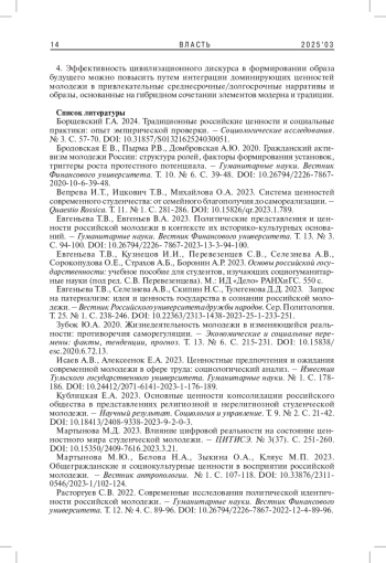 1. Борщевский Г.А. 2024. Традиционные российские ценности и социальные практики: опыт эмпирической проверки. - Социологические исследования. № 3. С. 57-70. DOI: 10.31857/S0132162524030051 EDN: KUOOBC