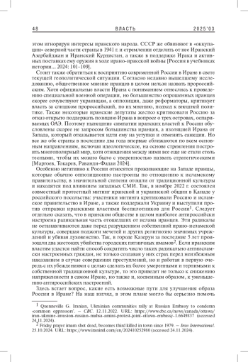 4. Маргоев А.Р., Токарев А.А., Раванди-Фадаи Л.М. 2024. Ложный выбор между пророссийским и безъядерным Ираном: существует ли стратегическое партнерство. - Восток. Афро-азиатские общества: история и современность. № 4. С. 89-101. EDN: OCAPWR