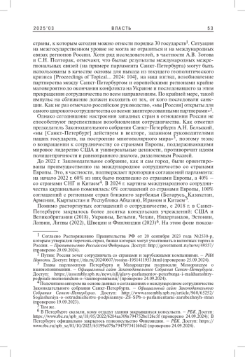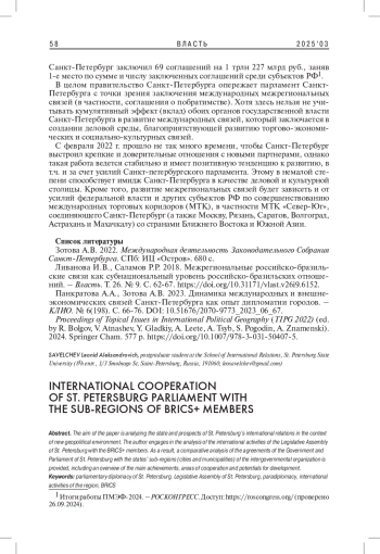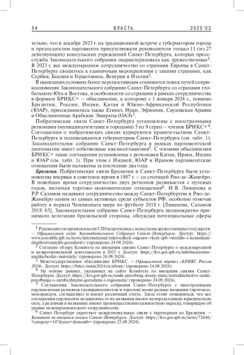 САВЕЛЬЧЕВ Л. А. МЕЖДУНАРОДНОЕ СОТРУДНИЧЕСТВО ПАРЛАМЕНТА САНКТ-ПЕТЕРБУРГА С РЕГИОНАМИ СТРАН - ЧЛЕНОВ БРИКС+ // ВЛАСТЬ. 2025. ТОМ 33 № 3