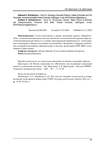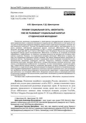 ЩЕКОТУРОВ А. В., ЩЕКОТУРОВА С. Д. ПОЧЕМУ СОЦИАЛЬНАЯ СЕТЬ «ВКОНТАКТЕ» УЖЕ НЕ РАЗВИВАЕТ СОЦИАЛЬНЫЙ КАПИТАЛ СТУДЕНЧЕСКОЙ МОЛОДЕЖИ? // ВЕСТНИК ПЕРМСКОГО НАЦИОНАЛЬНОГО ИССЛЕДОВАТЕЛЬСКОГО ПОЛИТЕХНИЧЕСКОГО УНИВЕРСИТЕТА. СОЦИАЛЬНО-ЭКОНОМИЧЕСКИЕ НАУКИ. 2025. № 1