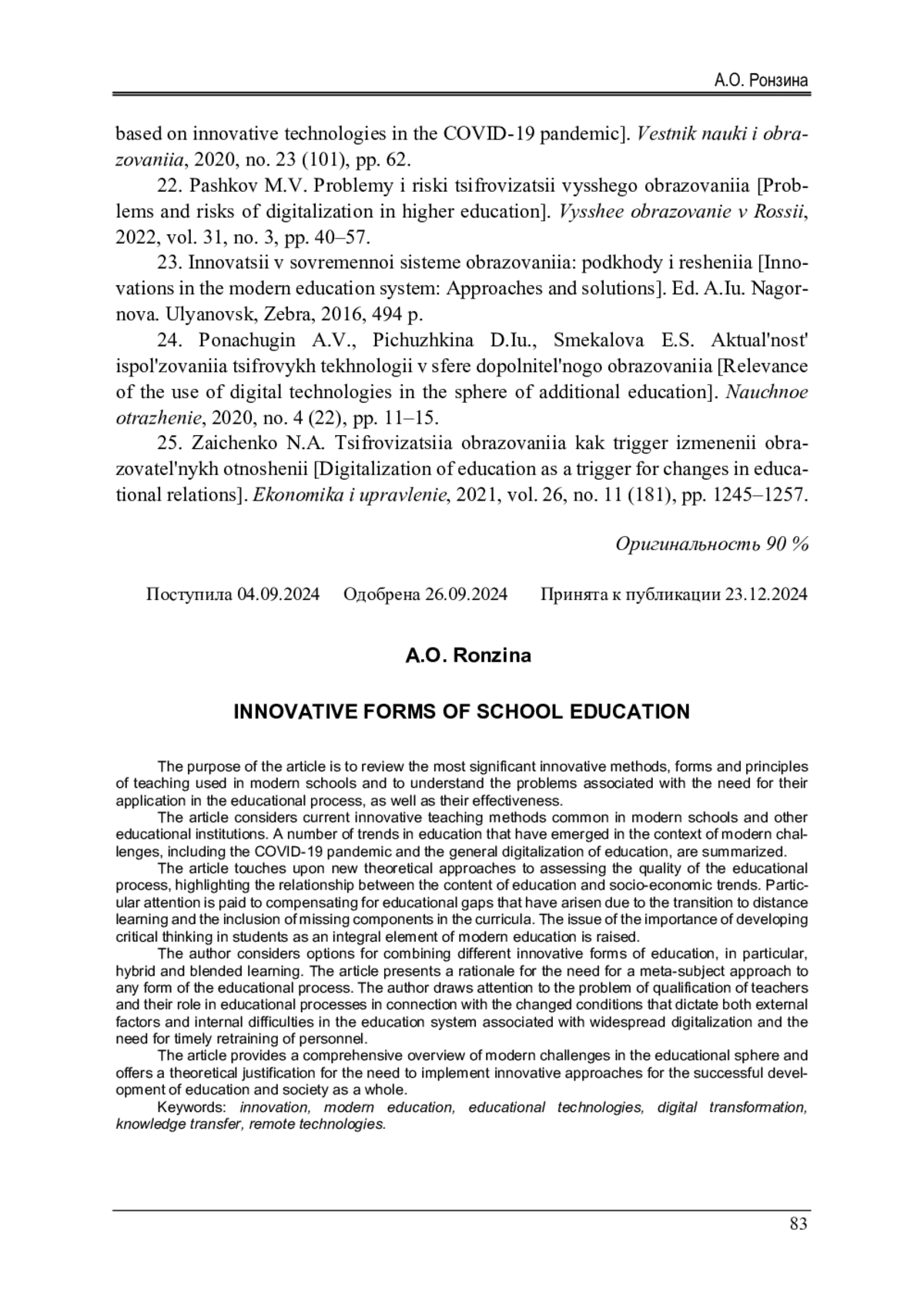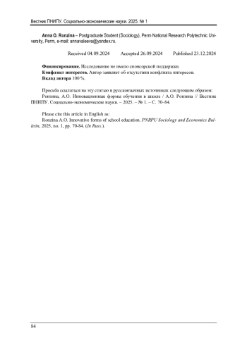 РОНЗИНА А. О. ИННОВАЦИОННЫЕ ФОРМЫ ОБУЧЕНИЯ В ШКОЛЕ // ВЕСТНИК ПЕРМСКОГО НАЦИОНАЛЬНОГО ИССЛЕДОВАТЕЛЬСКОГО ПОЛИТЕХНИЧЕСКОГО УНИВЕРСИТЕТА. СОЦИАЛЬНО-ЭКОНОМИЧЕСКИЕ НАУКИ. 2025. № 1