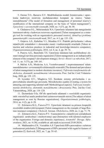10. Лысенко, Е.В. Создание системы привлечения и сопровождения талантливого персонала. Методические аспекты / Е.В. Лысенко, С.Е. Мягкова // Цифровая трансформация общества, экономики, менеджмента и образования: материалы II Междунар. конф. - Екатеринбург, 2020. - С. 116-129.